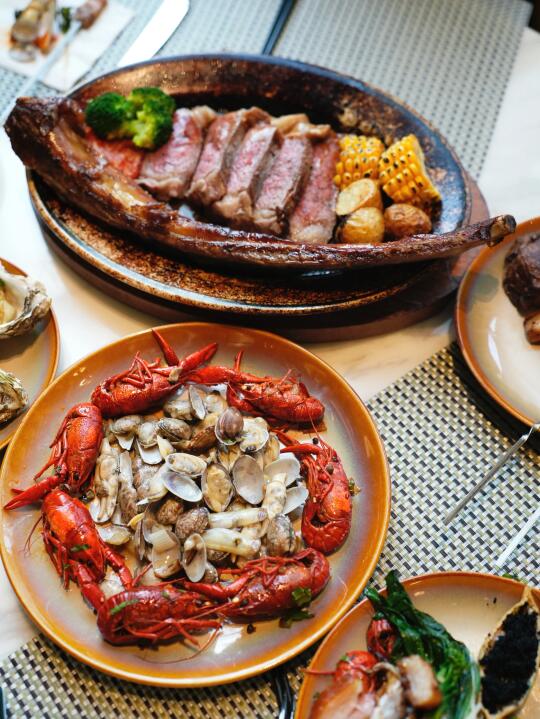 晚上我们选择在青岛金茂万丽酒店的燃全日制餐厅用餐,超赞的现切战斧及干式熟成牛排,还有很多新鲜的海鲜,现点现做。