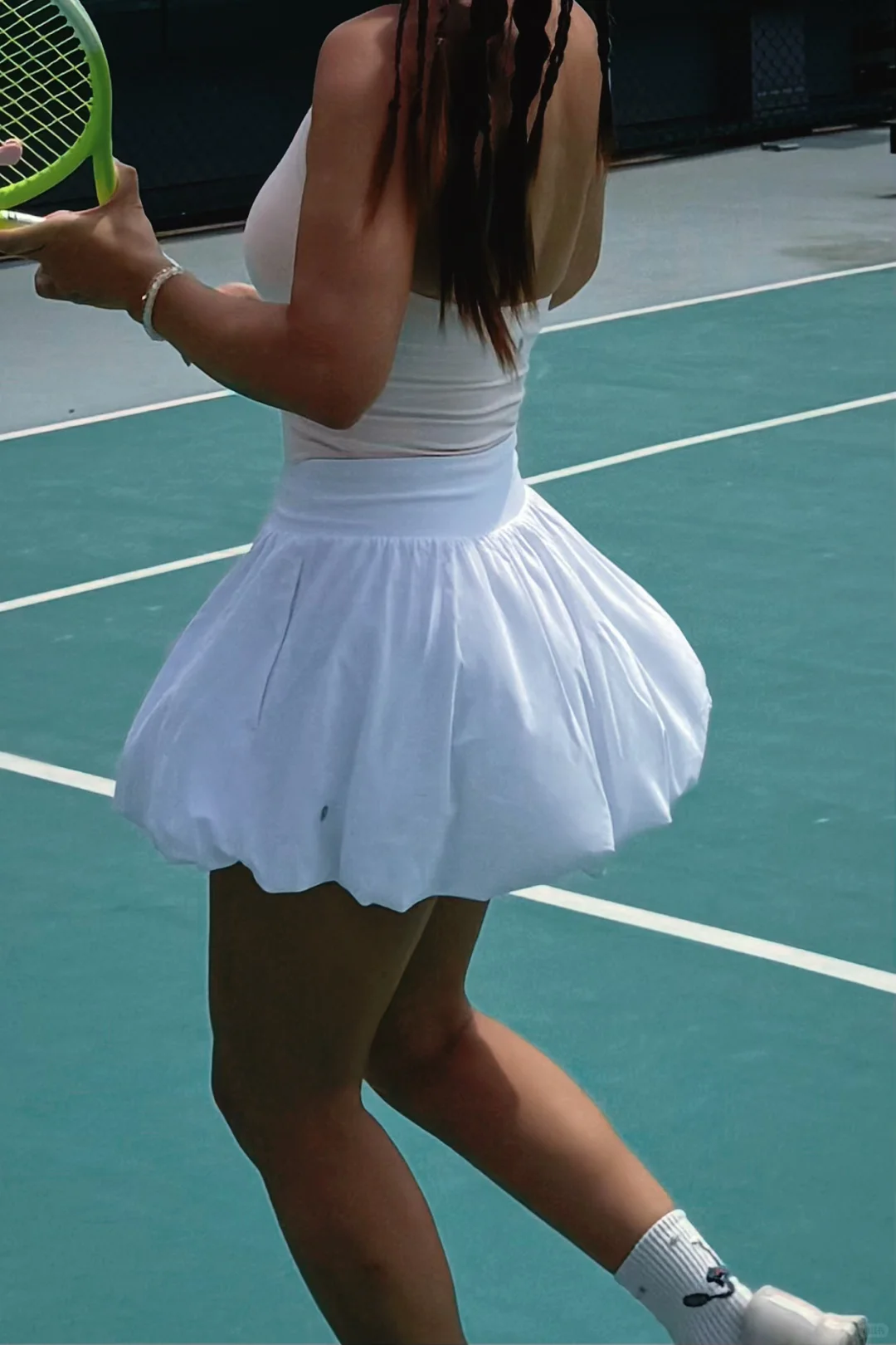 最近get了一套新装备! 花苞的设计在网球裙里面相对少些,超级遮肉显腿长,跑动起来好轻盈,飘飘的像朵云,内衬长度刚好完全不会走光 挂脖设计也超显锁骨和肩线,而且打球时超级稳,怎么挥拍都不移位
