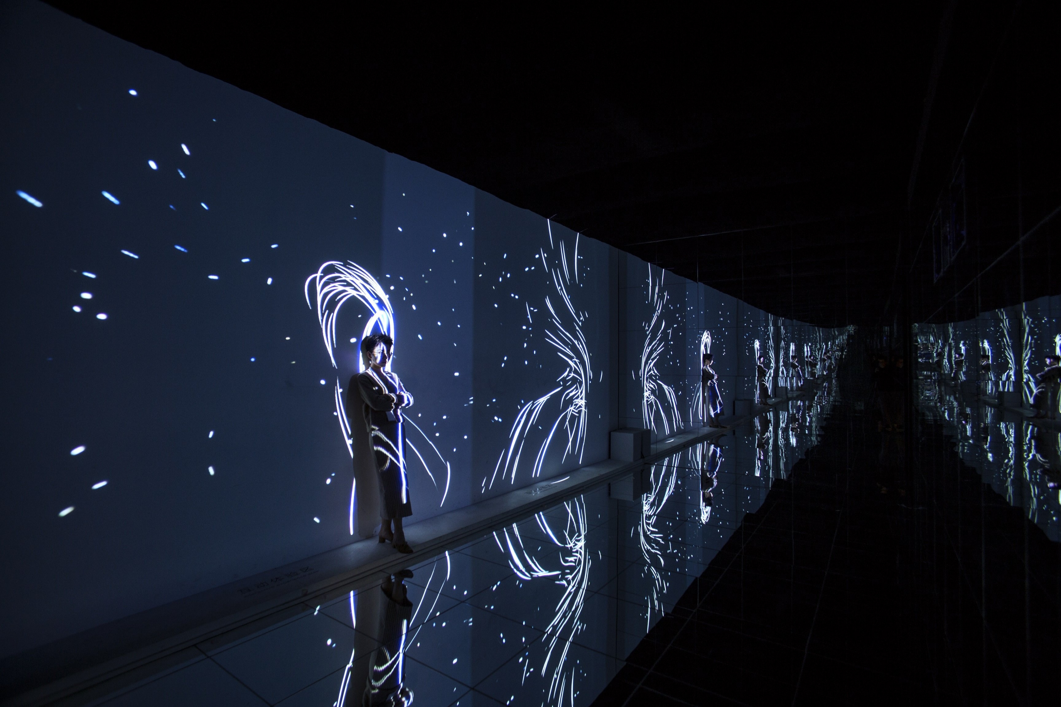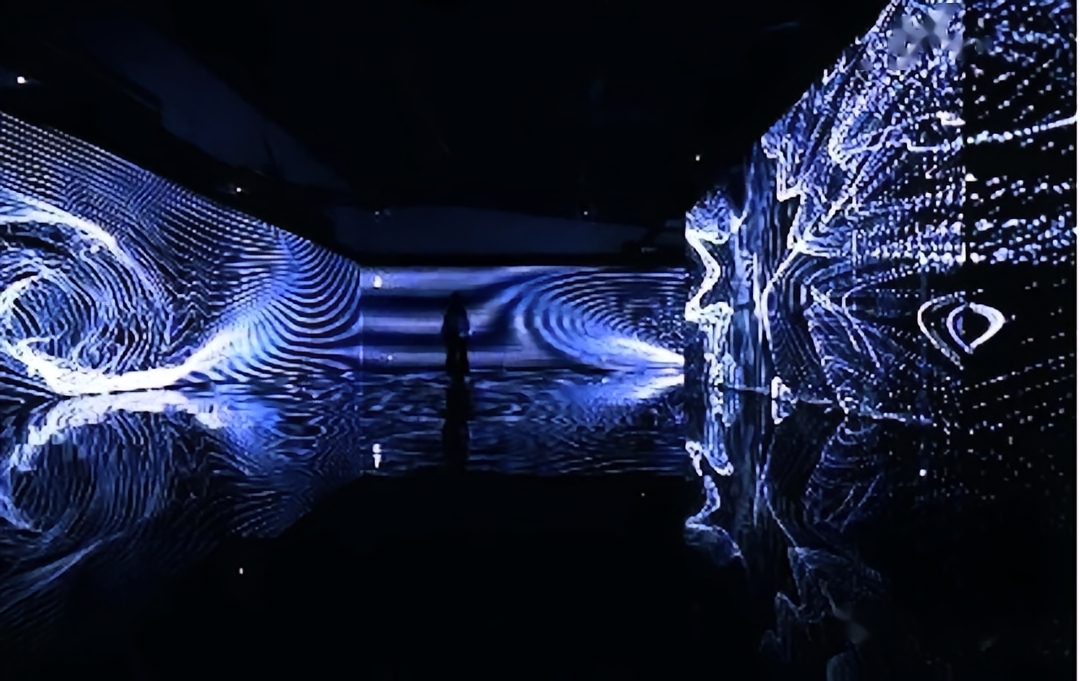 光影装置是数字装置艺术的主流形式,通过投影技术、LED灯阵等设备打造动态光影效果。日本teamLab团队的作品是典型代表,他们利用多通道投影将动态画面投射到墙面、地面甚至天花板,打造沉浸式光影空间;观者的移动会改变光影的流动轨迹,让整个空间成为一件可互动的“大型作品”。