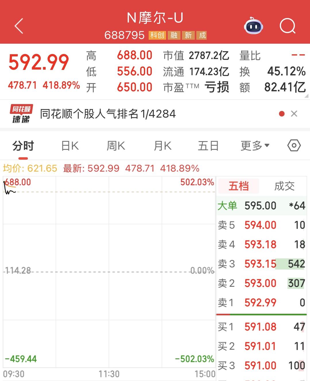 截至发稿,摩尔线程涨幅略收窄,涨418.89%,报592.99元/股。