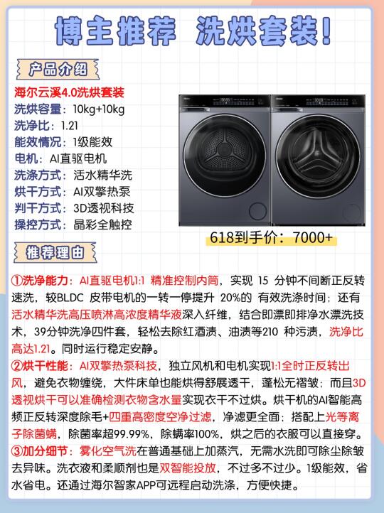 综合多方面剖析给大家推荐这款: 海尔云溪4.0洗烘套装!