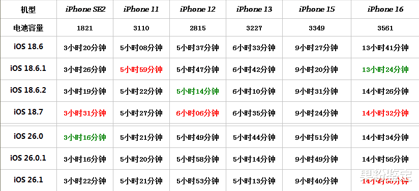 11月4号苹果凌晨发布了iOS26.1正式版,更新了很多新功能,不过大部分不怎么关注新功能,主要是关注升级后续航的情况,今天带来来自油管UP主 iAppleBytes 的电池续航测试。