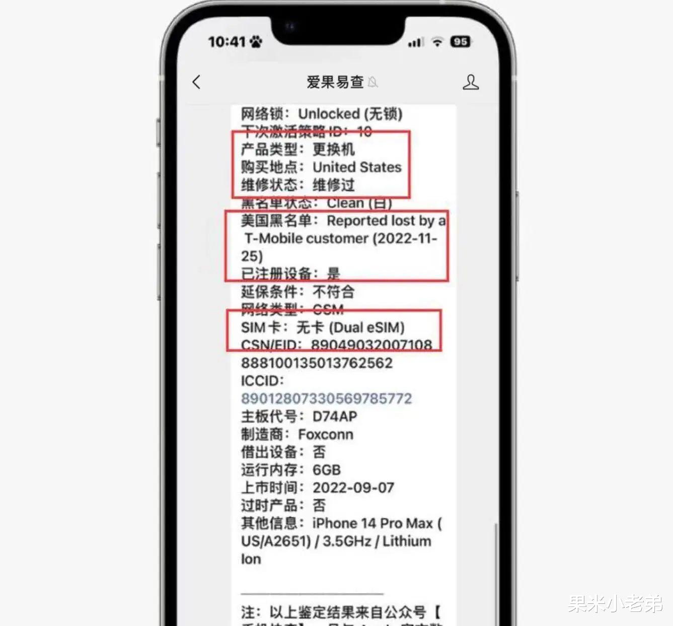 截图是这台iPhone14Pro Max的整机报告,可以看到该机是暗紫色128GB,激活状态是已激活,但无激活日期,而且已过了保修期。已更换序列号显示“是”,说明该机是黑机。这个手机还是美版的,我们都知道今年美版14是使用虚拟卡,要想在国内使用需要开卡槽,属于大修机,很多网友调侃,机器还没用,就变成了大修机!