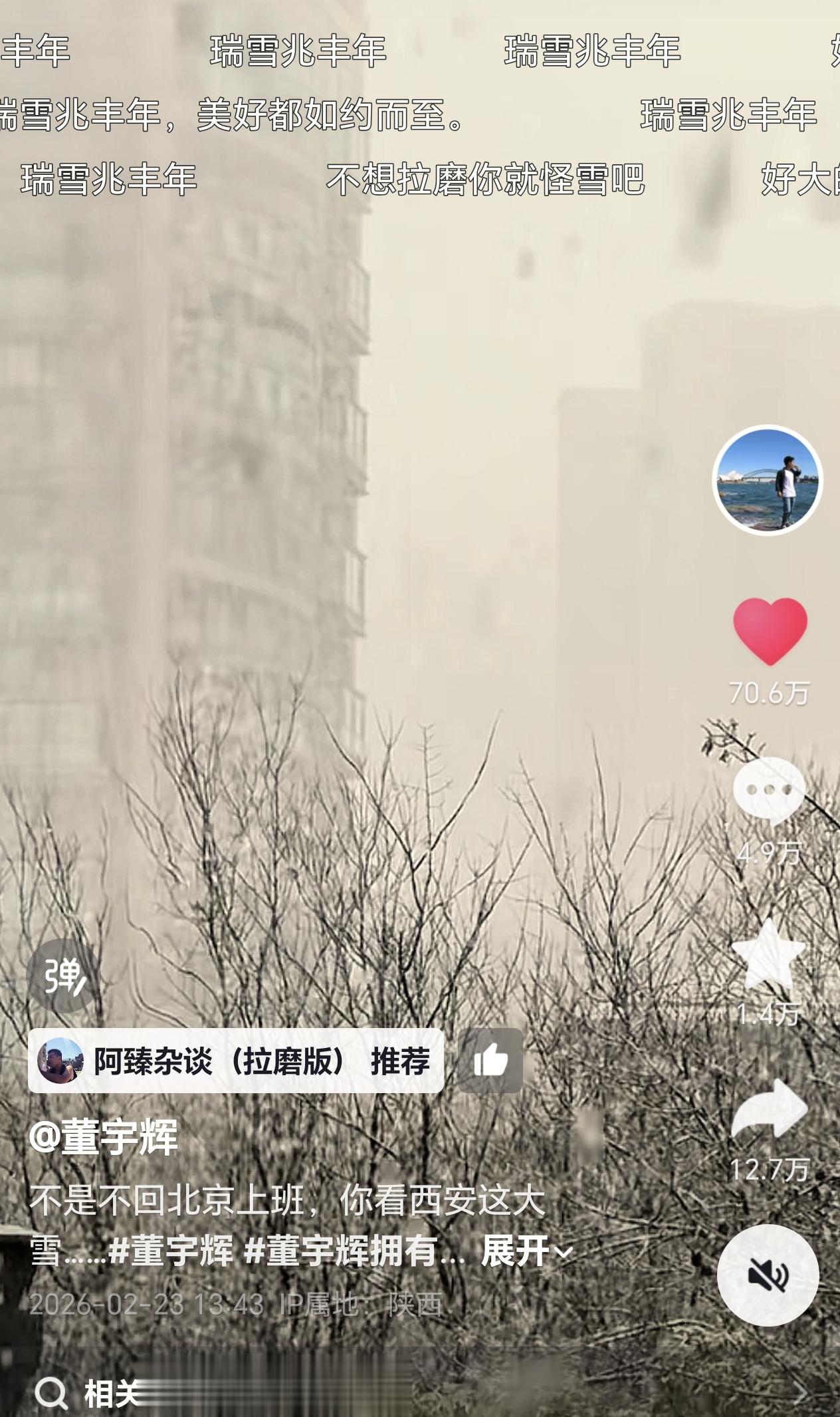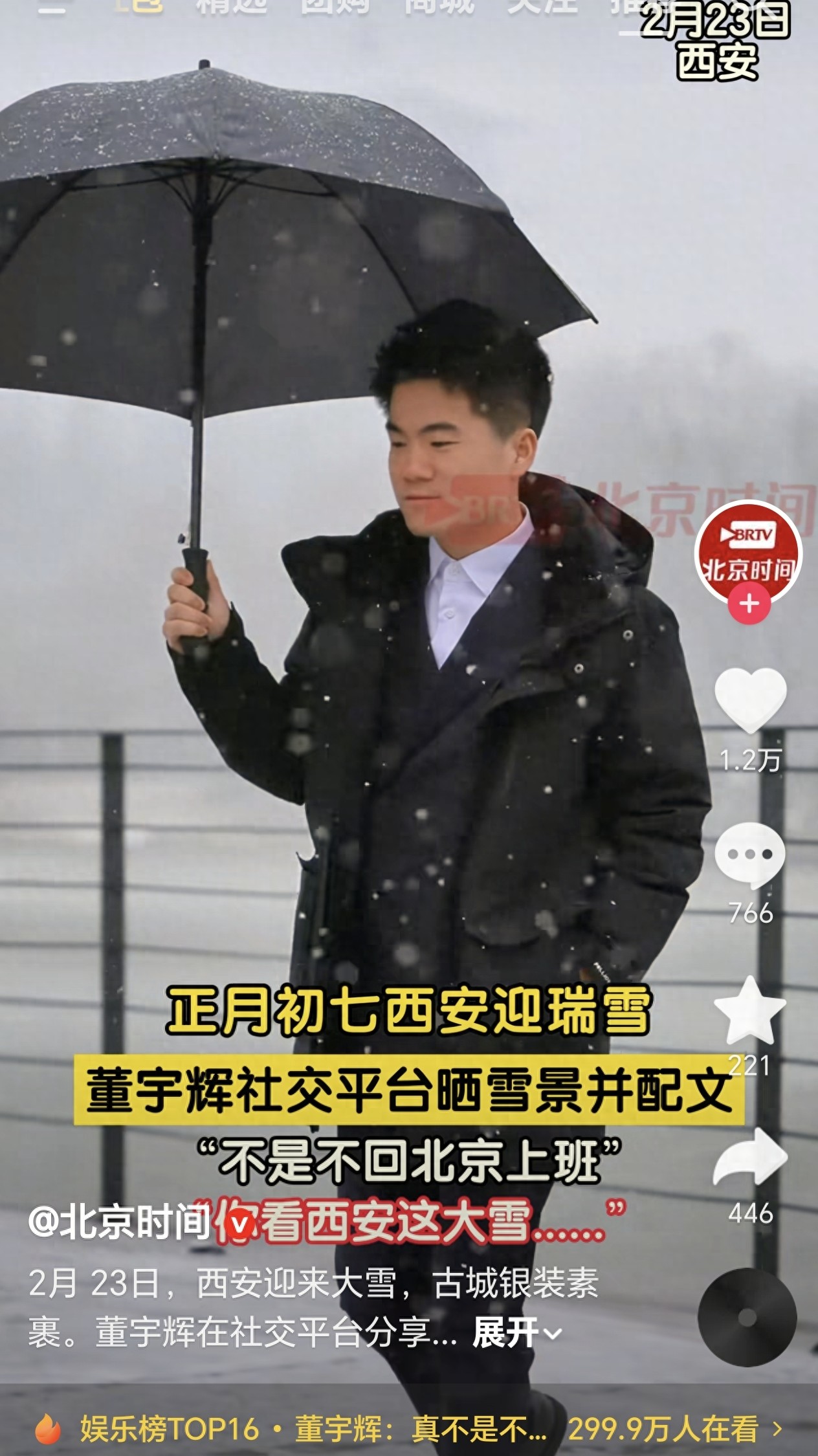 昨天23号下午1点多,已经两天没更新视频的宇辉突然在个人账号上发了一条“西安下大雪”的视频,并且配文道“不是不回北京上班,你看西安这大雪…”。当时看到宇辉发的这条视频的配文后就感觉事情有点不妙,因为这视频发的时间节点太巧了,第二天24号“与辉同行直播间”就要新年开工上播了,宇辉竟然整出这样一条视频来,那肯定是不想回来上班了的节奏。