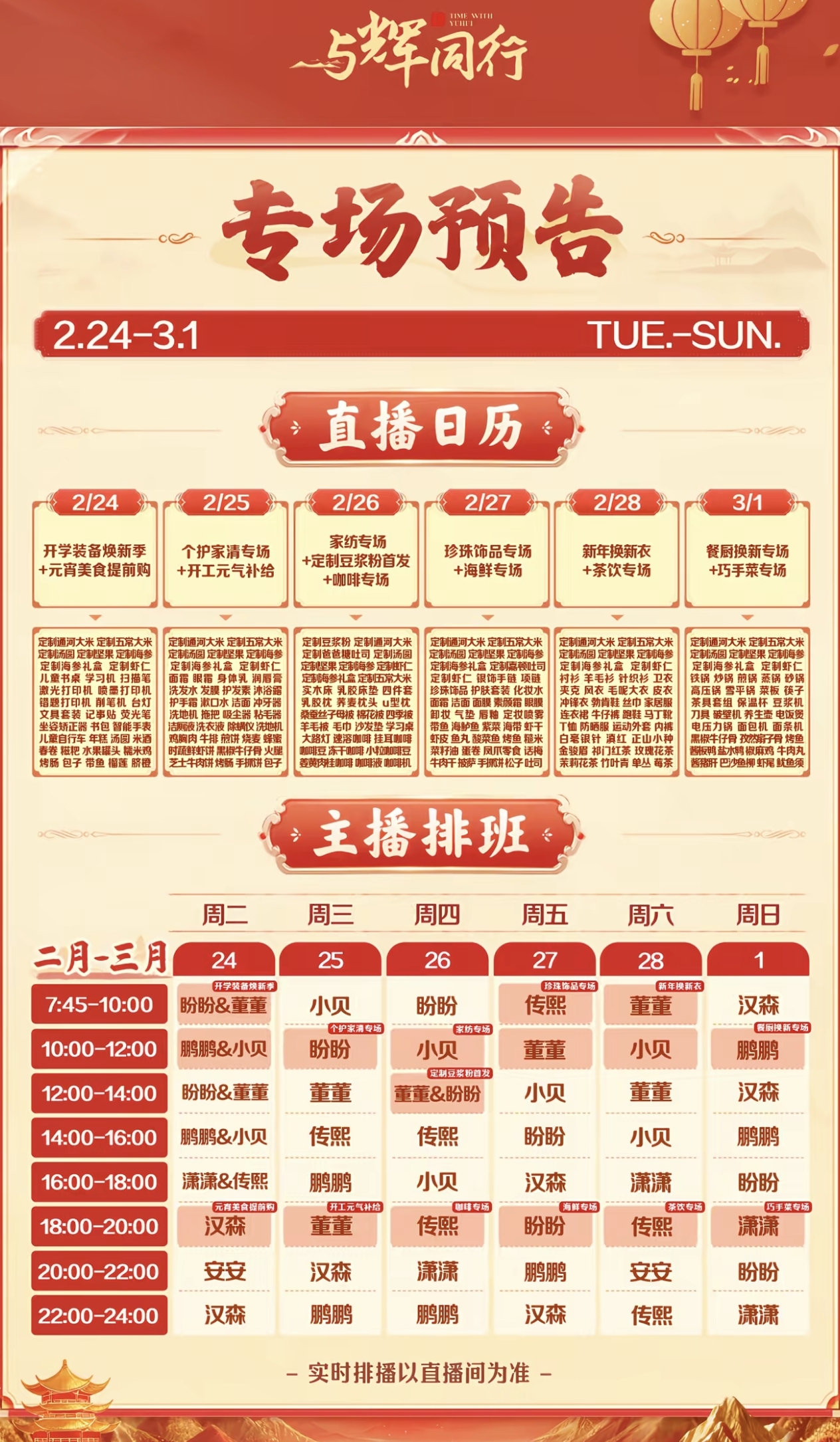 而今天2026马年开播首日,除了宇辉外,其他八位主播都是全员到岗的,于是整个白天每个时段都是两位主播双播的排班。