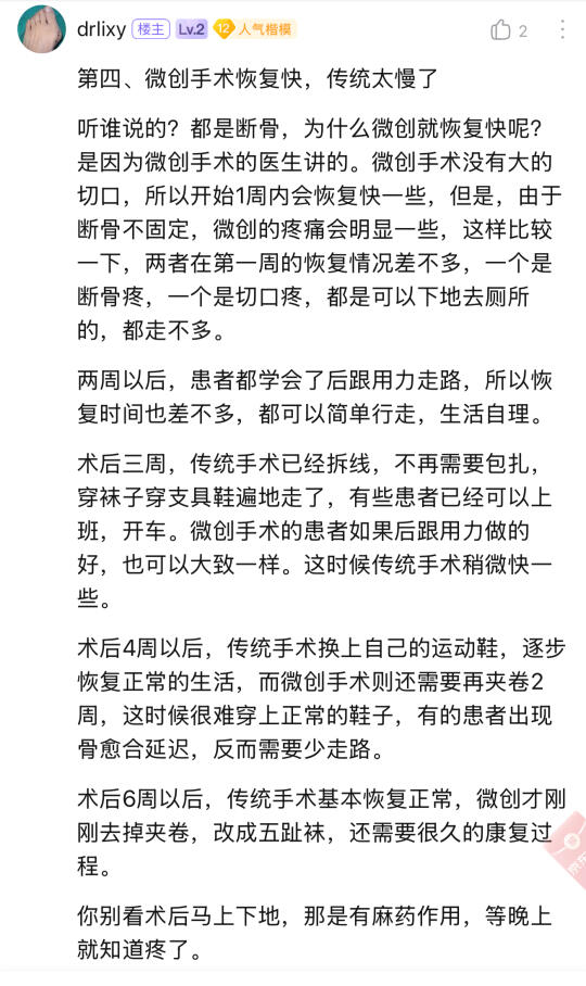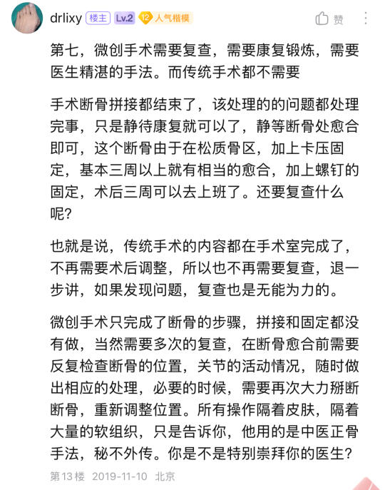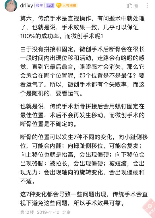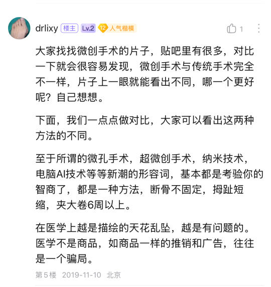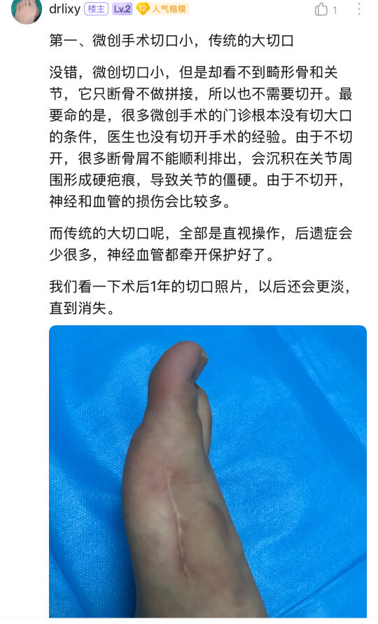 无论如何,这是个断骨手术,那个断骨最终放置的位置决定了手术的优劣,没有片子的科普基本都是假科普,说的再好,第18代超微创技术的创始人,找一找他6年前的片子,或者你等他6年,有问题的难长久的。