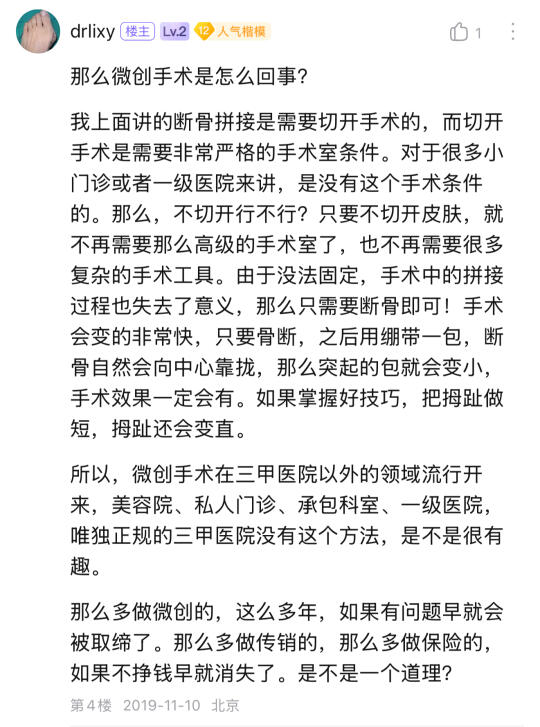 拇外翻手术从来不是必须做的手术,所以始终无法进入三甲医院的主流疾病里,主流不重视就给非主流留出了空间,而非主流只能依靠网络宣传吸引病源,所以就形成了目前的就医结构。
