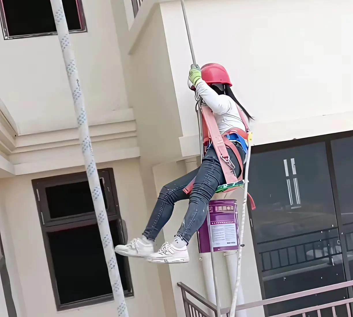屋外高空作业的这些蜘蛛人,拉近一看,竟有一位年轻的女孩,让我惊讶的同时,也让我不禁起了同情心,这么年轻的女孩子,在户外干这么重的体力活,而且还这么危险,女孩是为了生活实属不易呀!这生活中的每1分钱都是用汗水换来的,我们要珍惜现在来之不易的幸福生活,有多少辛勤的打工仔打工妹在每天用辛勤的汗水挣取生活费!
