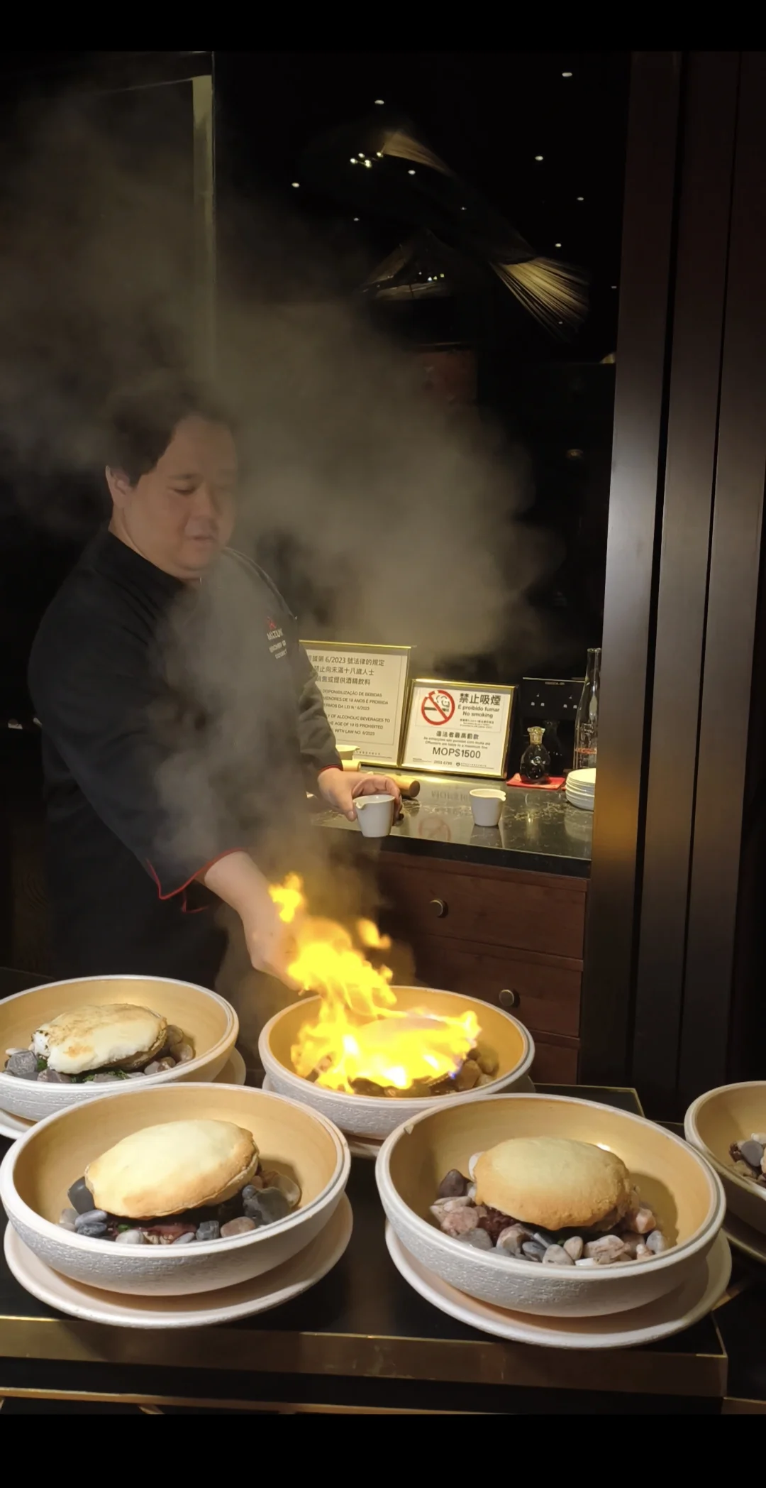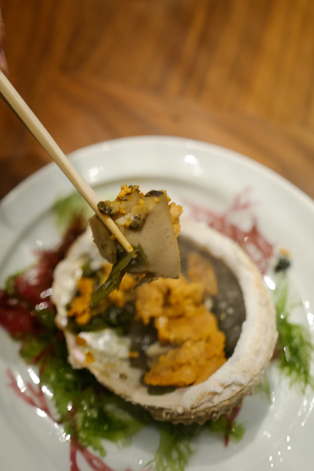 Off menu是盐焗大鲍鱼和马粪胆,也是互动性非常强的一道菜,又是点火又是敲壳,完全没有原来怀石的拘谨。