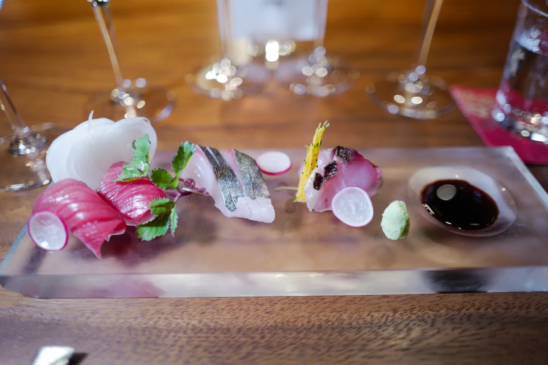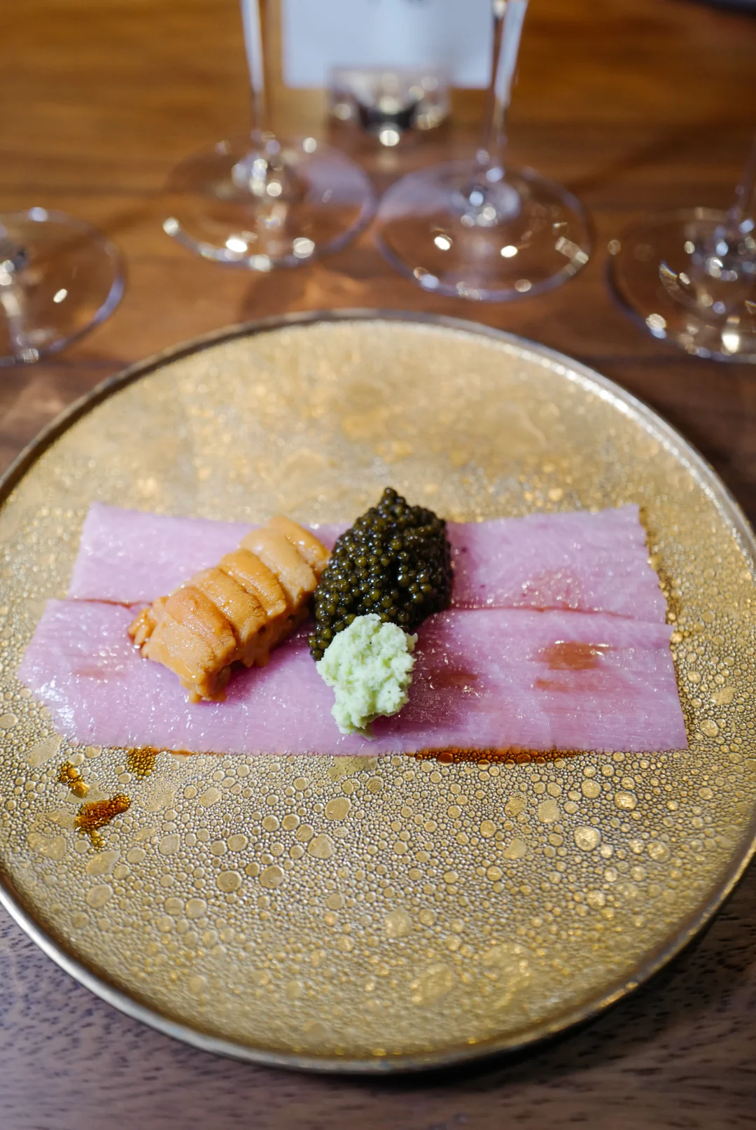 现在的泓有清酒吧,铁板区,寿司区和日料区。菜单里有很多share的菜式,互动性比之前强很多。主厨现场切的toro超级大片,包上海胆鱼子酱,超级肥美,一人两大片吃的我两眼放光。