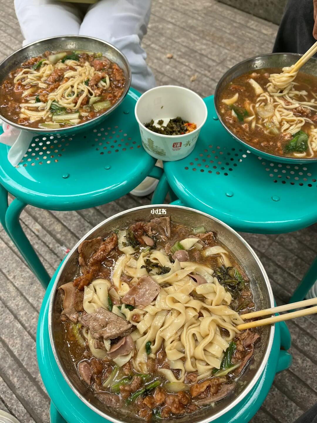 因为离家很近,东亭的廖记汆汤是我常吃的汆汤小店,我喜欢点腰花瘦肉猪肝三合一,用细粉或者苕粉下,更滑爽入味,偶尔吃财鱼面换换口味,一定要叮嘱老板下手工面!不过,自从前两年拍摄过早短视频,让这家小店“爆火”之后,我就来得少了。每每经过门口,看老板夫妻俩人忙活,食客满座,大家兀自在街边高低凳子就餐,头上的遮阳的法桐,形成一个天然阴凉的“大伞”,真是一幅有趣的市井画面呀!