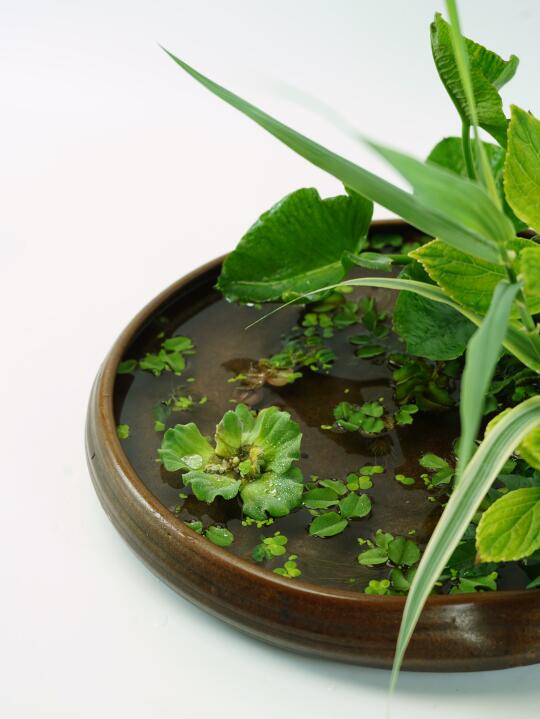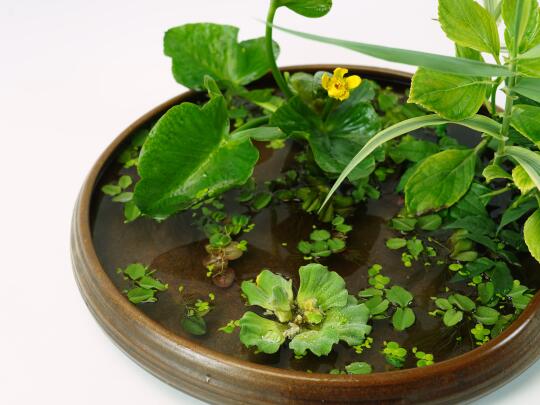 写景盛花自然本位,最适合表演夏天的清凉水边了。 花材:河骨、暖竹、绣球花叶、浮萍