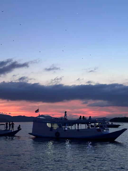 目前国内没有直✈️,可以在雅加达、巴厘岛、新加坡转机,1h直达,科莫多的船宿很有名,但我们时间没对上,所以最终找了1.5天的小团,下午半天看蝙蝠归巢,第二天全岛一日游。