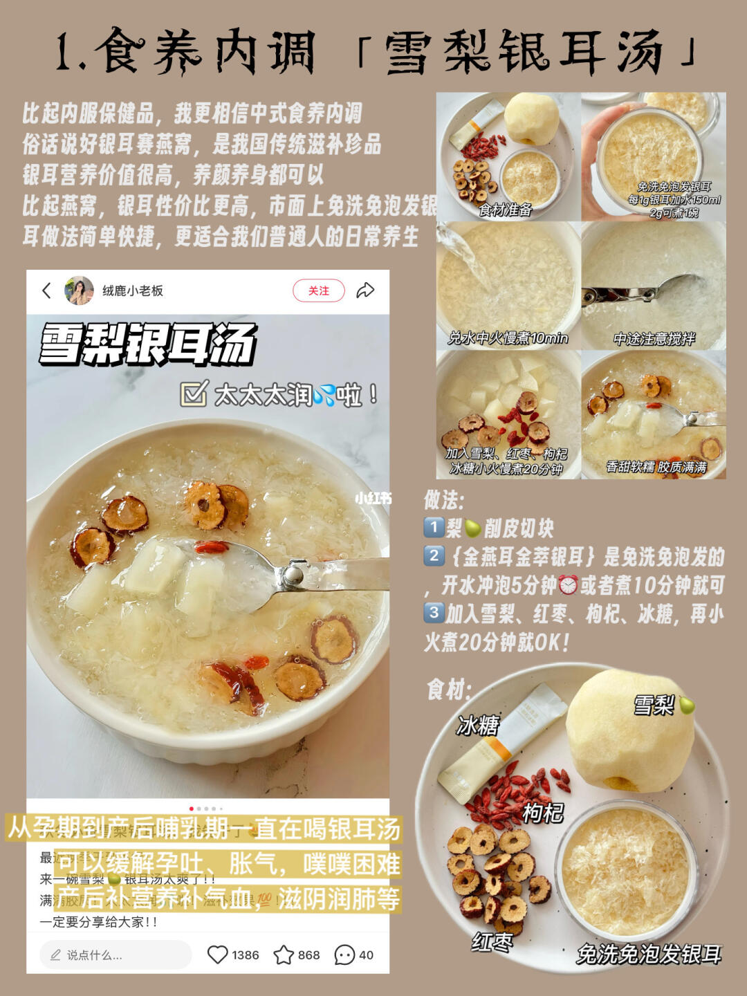 因为孕期、产后需要补充的营养很多,但忌口很多😱,听中y闺蜜的建议,从孕期到产后哺乳期一直在喝银耳汤,确实缓解孕吐、胀气,噗噗困难,产后补气血,滋阴润肺。。。