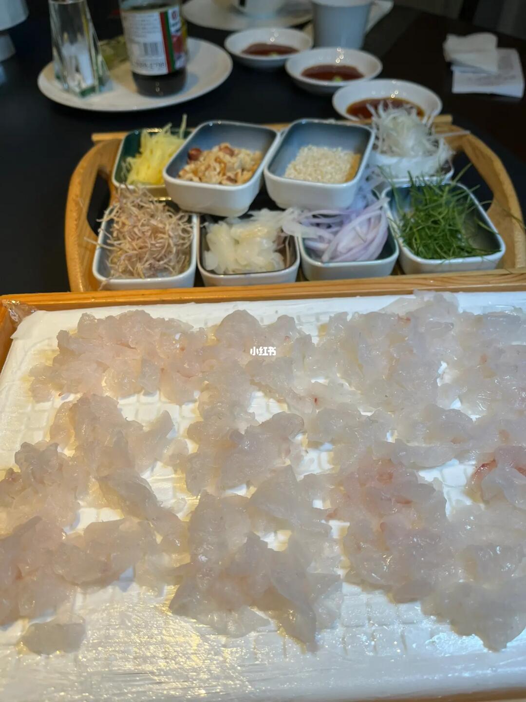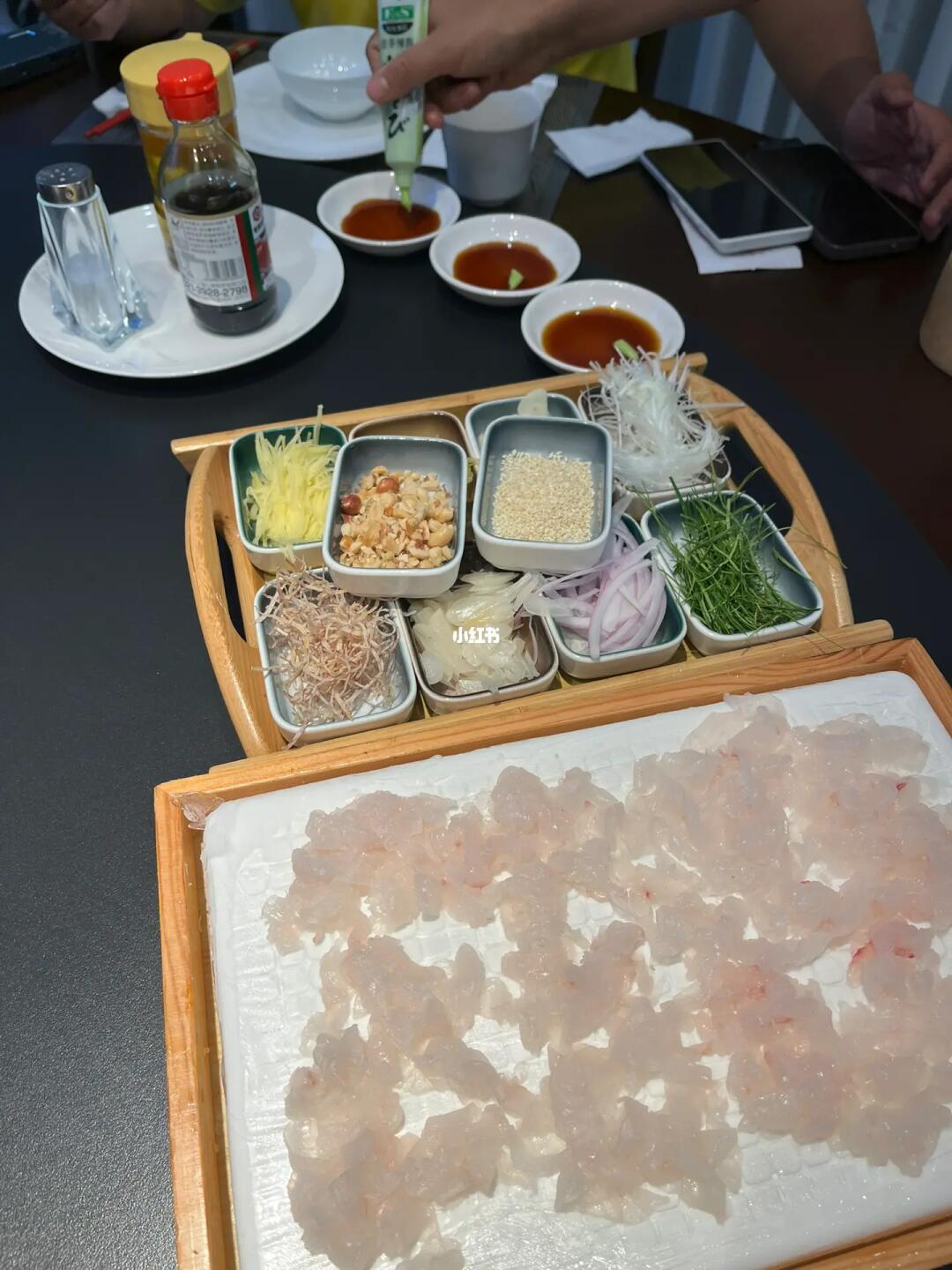 美味鱼生端上桌,薄如蝉翼,呈半透明状,古人所言“食不厌精,脍不厌细”也。此外,还需一些佐助,备好蒜片花生碎姜丝洋葱丝白芝麻木瓜丝柠檬叶等十种左右风味小料,添加广东雷州半岛小粒花生油带来浓郁的香气,还少不了好酱油青芥末做成的料碟。这样地道的广东鱼生,我们以一瓶劲酒杀菌,抚慰心理,三人一扫而光,只不过须臾之间……