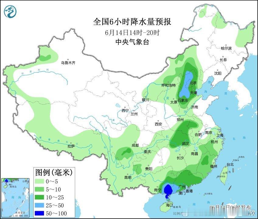 预计,6月14日08时至15日08时,广东大部、广西东部、海南岛中北部、福建东南部、湖南南部等地有大到暴雨,其中,广东西部、广西东部等地部分地区有大暴雨,局地特大暴雨(250~280毫米);上述部分地区伴有短时强降水(最大小时降雨量20~50毫米,局地可超过70毫米),局地有雷暴大风等强对流天气。