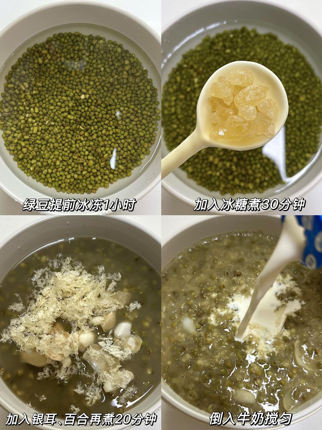 软绵香甜的绿豆银耳羹!! 好喝!养颜!解暑!还低卡~ 加了银耳的绿豆汤 入口软软糯糯又温润清凉 再放进冰箱冷藏一下 夏天吃真的超爽! 步骤如图⬆️超简单的做法