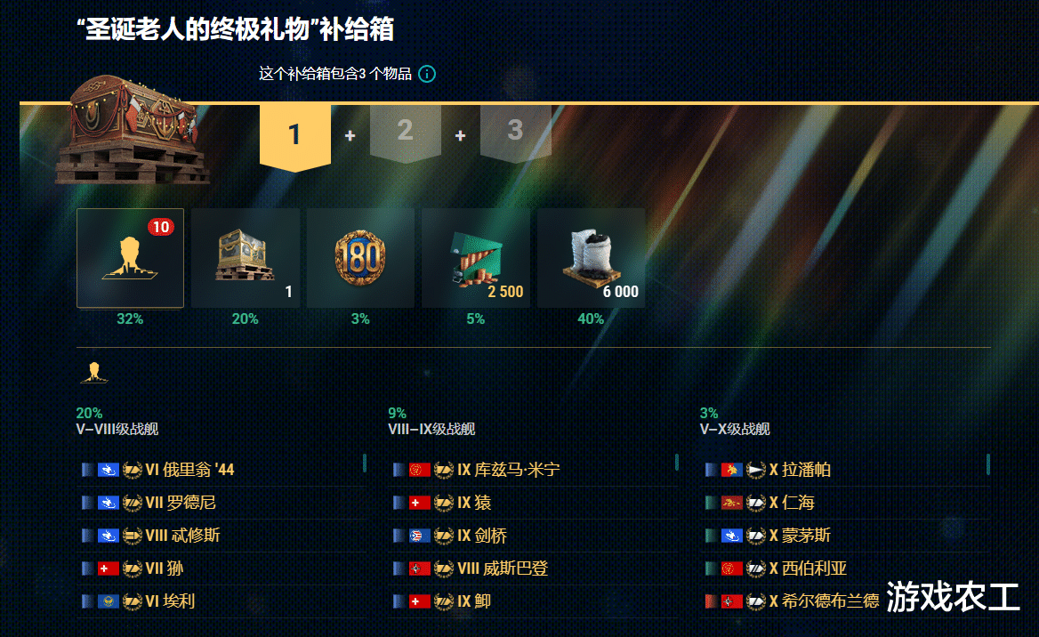 另外,今年圣诞活动还新增了“圣诞老人的终极礼物”补给箱,这箱子仅限军械库用RMB购买。池子内容和其他圣诞箱相同,但高级船和稀有船的爆率更高,而且掉落其他奖励的数量也更多!对于想提升出货效率的玩家来说是个不错的选择。