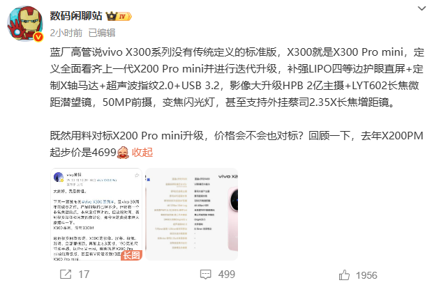 就在刚刚,知名博主@数码闲聊站 发文称:“蓝厂高管说vivo X300系列没有传统定义的标准版,X300就是X300 Pro mini,定义全面看齐上一代X200 Pro mini并进行迭代升级,补强LIPO四等边护眼直屏+定制X轴马达+超声波指纹2.0+USB 3.2,影像大升级HPB 2亿主摄+LYT602长焦微距潜望镜,50MP前摄,变焦闪光灯,甚至支持外挂蔡司2.35X长焦增距镜”。难怪之前有网友说VivoX300这配置确定是标准版?影像都不输友商的Pro了!