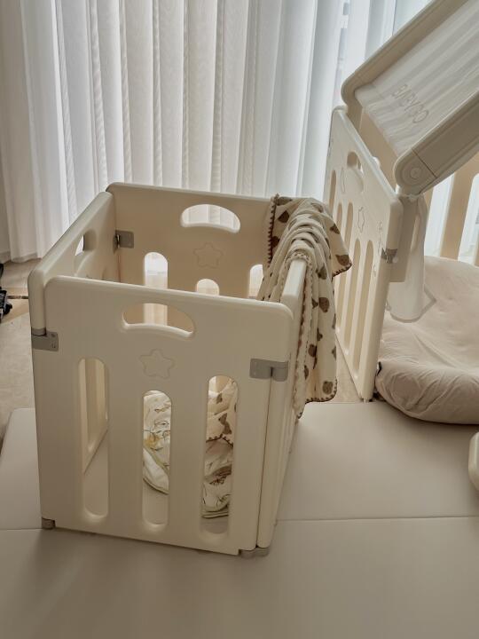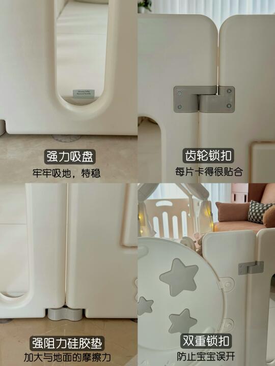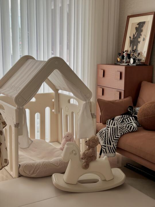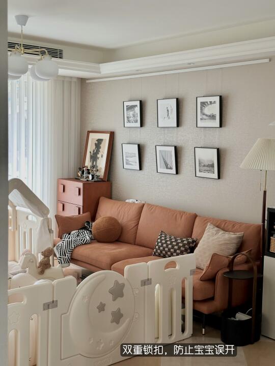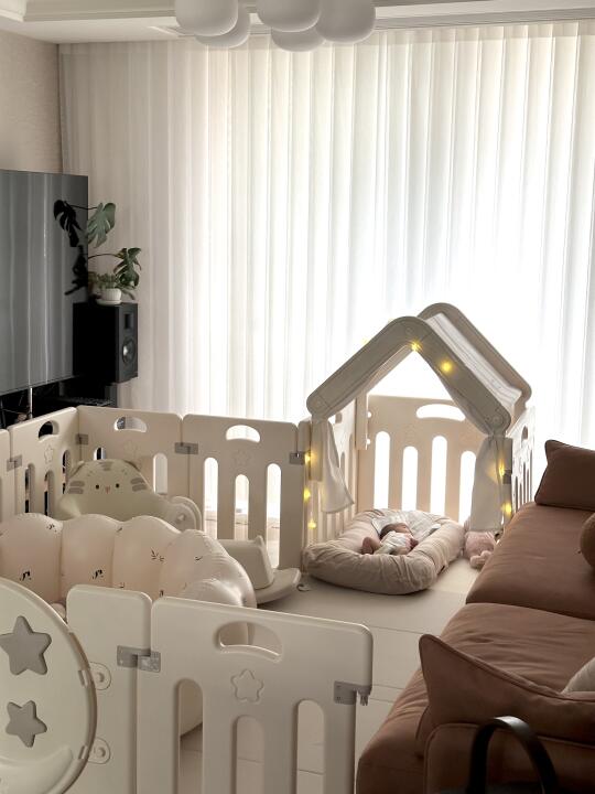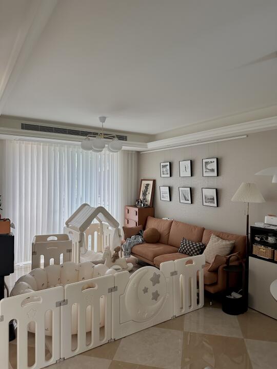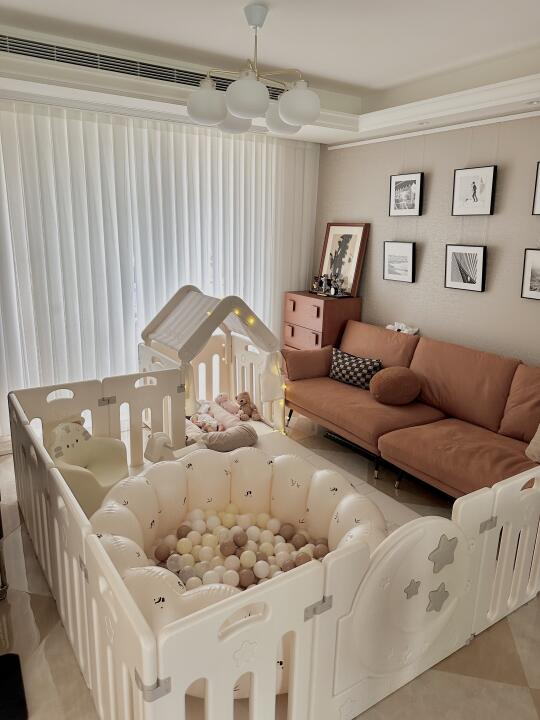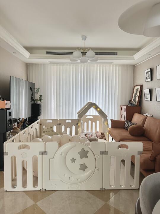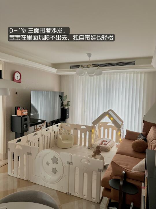 📍杭州 🏠建面91㎡,套内76㎡,三室两卫小户型 🧺客餐厅只有20平出头,却也是家里最大的空间 - 有了娃以后家里的布局在慢慢变化 客厅就想着适应宝宝👶🏻不同成长阶段进行改造 zui近新增添了不少的大件, 入手了围栏、爬爬垫、球池、摇摇马和小沙发 打算直接把客厅改造成宝宝的儿童房 - 🟡现在宝宝才一个月大铺上PU爬爬垫, 4cm厚度,减震回弹性更好, 而且质感很细腻和我家的装修风格也和搭 可以在里面练抬头,做早教,搭配床中床白天躺着看黑白卡 - 🟡等宝宝到了五六月龄的时候,围栏就可以布置上了 做四面围或者三面围包裹住沙发,可以在里面学爬学扶站 而且babygo星月围栏还是四重加固 吸盘抓地,硅胶垫防滑,齿轮卡扣卡死,还有双重童锁 平时我自己在家也能独自带娃,很省心 - 🟡等宝宝到了1岁多,对活动空间要求更大 就能改成单面围,再搭配一些宝宝爱玩的玩具 直接改成儿童乐园~ - 小户型的家, 具备长期主义的产品才有实用性, 期待她在这个围栏乐园里慢慢长大咯~