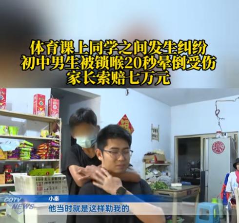 重庆,一女生投篮,不小心把一男生鼻子碰流血了,男生就跟女生说,你给我等着,旁边的一个同学听到了重复了一句,结果那个男生上来就勒住他的脖子,足足20秒,同学随即晕倒在地,差点失去生命,事后这个同学要求那个男生一家人赔偿7万,男生的家长说:这件事又不是他们的全部责任,赔偿7万元太多了。 事发当天,小秦正在操场上体育课,期间他亲眼目睹了女同学投篮砸到男同学小熊的脸上。 本来这不是什么大事,女同学道个歉也就过去了,结果小熊却不依不饶,甚至还放了一句狠话,跟女同学说了一句:“你给我等着!” 女同学不小心砸到小熊,这并不好笑,可当小熊说出来这句话后,小秦就没忍住,便笑着重复了一遍。 据了解,小秦认为小熊被砸到,纯属自己不小心,结果还要反过来怪罪别人,尤其是放狠话环节,感觉非常搞笑。 或许是认为小秦在嘲讽自己,小熊瞬间就来了脾气。他直接上前勒住小秦的脖子,说什么也不肯放手。 其实小秦跟小熊并无太多交集,彼此间也不够了解。 没想到就是这么一句玩笑话,竟然让小熊对着同学下死手。 被锁脖后,小秦瞬间感到呼吸困难,紧接着便意识模糊,不省人事,等再次睁开眼,才发现体育老师一直帮自己掐人中,并感觉嘴巴和下巴有剧烈的疼痛感。 后来,小秦在记者身上示范了一下小熊当时的锁脖子动作,不到3秒钟,记者就感觉到明显的呼吸困难。 要知道,小秦只有12岁,可即便如此,他还是能轻易做到让记者呼吸困难。 但小秦却被小熊足足锁脖了整整20秒,绝对算得上下死手。 最可恨的是,小熊从始至终都没有给小秦道歉,始终都在旁边冷眼相看,可谓毫不在乎同学的死活。 小秦家长认为,自己孩子遭受到校园霸凌,对方的责任非常明显,故向小熊家长索赔70000元。 不过小熊家长却认为,是小秦挑衅在先,不打算承担全部责任,并要求警方对责任进行划分。 “他们要我15000元的精神损失费,还有牙齿等方面的费用,这既不合情也不合理,肯定是要划分责任的。” 很明显,小熊家长并不想承担全部责任。 目前,双方仍未达成一致意见,相关部门已经投入调查工作中。 校园霸凌时常触动人们的神经,这件事曝光后,很快引起了网友们的广泛热议。 有网友表示,小熊打人的行为理应得到严惩,这不仅仅是下手不知道轻重这么简单,而是真正意义上的杀人未遂,现在不处理,早晚会惹出更大的乱子。 也有网友表示,子不教父之过,小熊家长应该承担最大责任。 一方面,小熊情绪极其不稳定,心中稍有不快,就选择用暴力解决问题,足以看出其家长并未尽到教育义务。 另一方面,小熊犯错后,其家长没有选择主动承担责任,反而试图倒打一耙,这只会对孩子起到不好的影响。 试想一下,如果小熊没有付出沉重的代价,以后他在惹事生端,可能潜意识就认为父母会替自己摆平一切。 惩罚不是目的,主要还是希望小熊能认识到错误,其家长要是不想付出相应的教育成本,以后必然会付出更大的代价。 当然,还有网友提出反对意见,认为小秦的调皮捣蛋才是罪魁祸首,理应承担部分责任。 那么对此,您持有怎样的看法呢? 今天的分享到这里就结束了,大家对此事有何看法,欢迎在评论区留言和讨论,感兴趣的可以点击头像加关注,我将每日更新优质内容,我们下期见。 信源: 原文登载于重庆天天630 2025年06月13日关于《初中男生被锁喉20秒晕倒受伤家长索赔七万元 小秦今年十二岁,本应该是开心上学的年纪。可是最近几个月,小秦却对于上学这件事非常抵触。而导致这样情况的原因,还要从两个月前的遭遇说起。》的报道