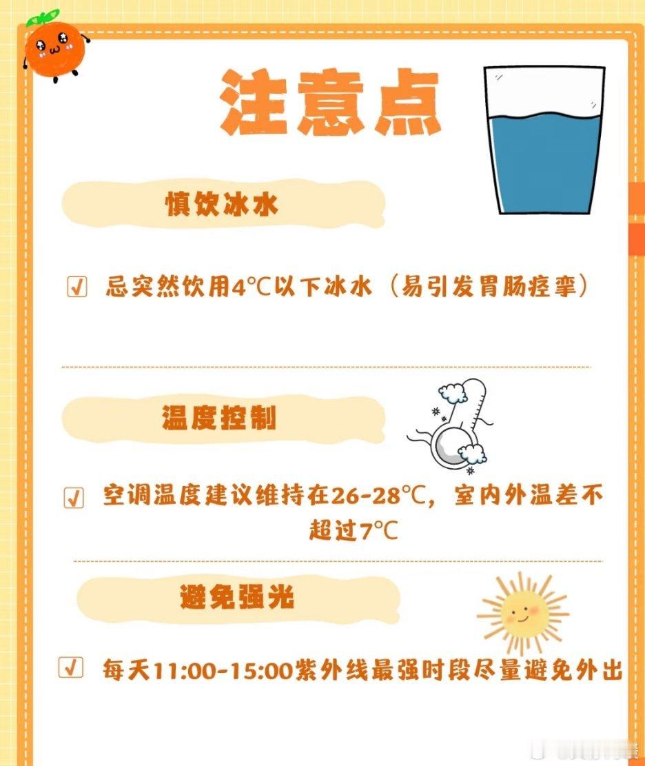 不过要注意,别喝4℃以下冰水,易致胃肠痉挛;空调温度26 - 28℃,内外温差不超7℃;11 - 15点紫外线强,尽量不外出。 冷知识百科生活技巧