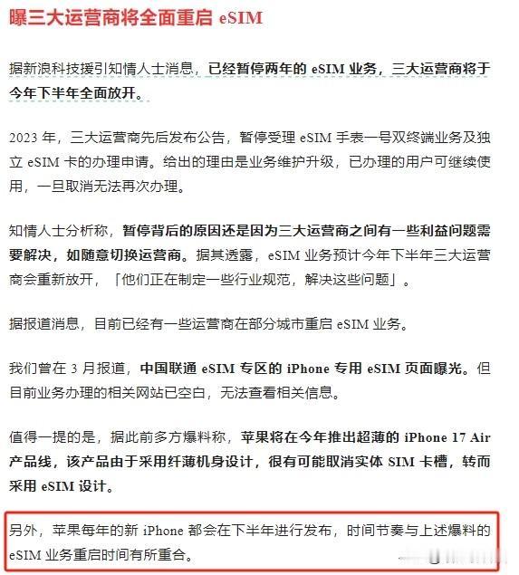 eSIM卡要来了!苹果的影响力是真不小~ 原本还想着iphone 17 air的国行版是会有特供版还是会如何调整,但万万没想到苹果居然能推动三大运营商的 eSIM卡落地,属实是有点惊喜! 另外除了首代的标准版SIM卡,后续每次调整貌似也都和iPhone有着一定的关联... Mini SIM卡→Micro SIM卡→Nano-SIM卡→eSIM卡 这样来看苹果还是挺厉害的吧。