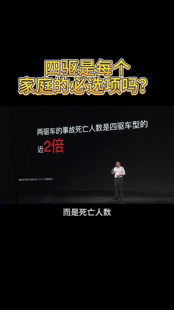 四驱是每个家庭的必选项吗? 先来看一组数据,根据美国公路安全保险协会的统计,在同等的里程下两驱车的死亡人数是四驱车的两倍。注意是死亡人数,不是事故人数也不是受伤人数,而是死亡人数。数据不会说谎,关键时刻四驱和两驱的区别就是守护家人安全的第一道防线。 这个沉重的数字面前已经不需要再继续讨论四驱是不是刚需,事实上如果站在安全的角度来看每一个家庭都需要四驱,四驱是一个家庭的移动之盾和贴身的安全防线。