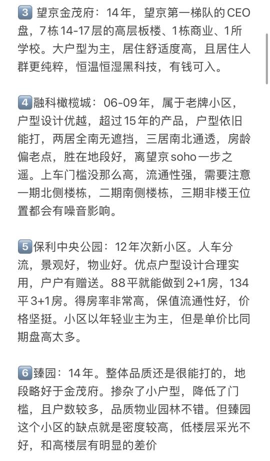 3️⃣ 望京金茂府:14年,望京第一梯队的CEO盘,7栋14-17层的高层板楼、1栋商业、1所学校。大户型为主,居住舒适度高,且居住人群更纯粹,恒温恒湿黑科技,有钱可入。