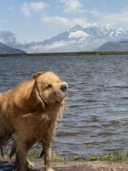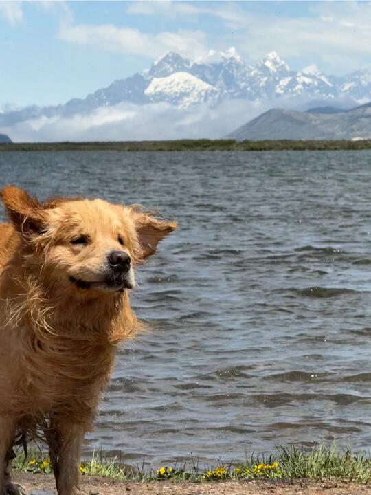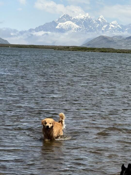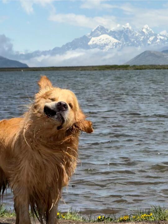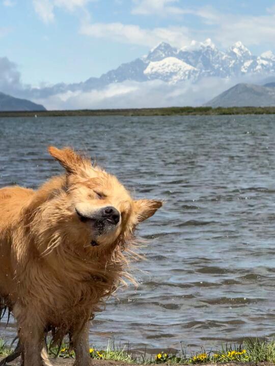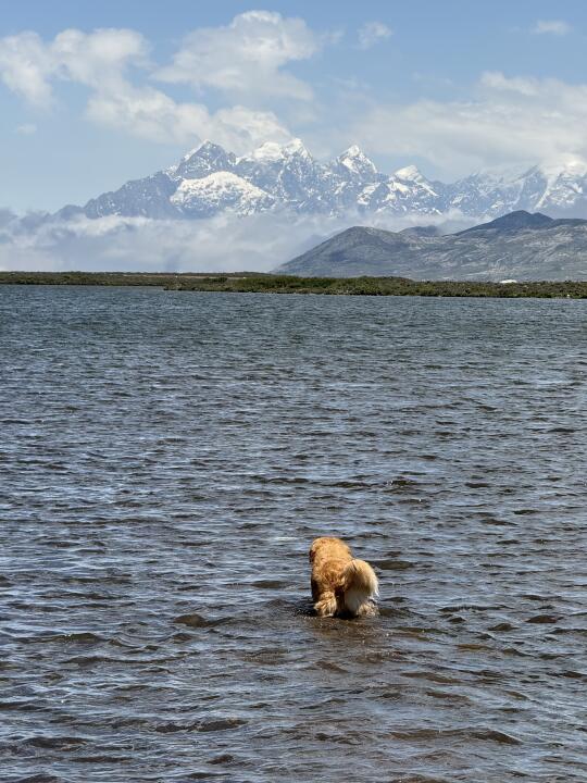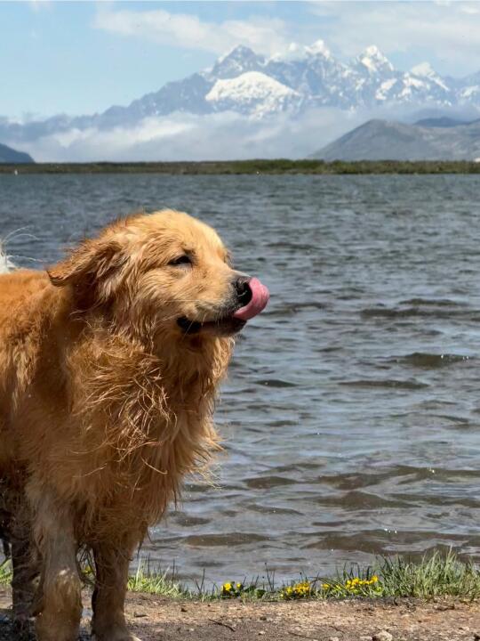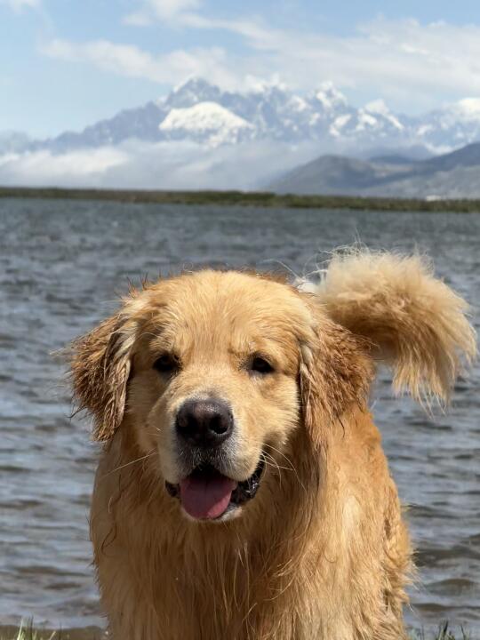 雪山 湖泊 自由自在健健康康的快乐小狗
