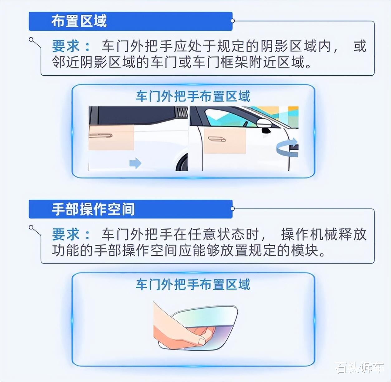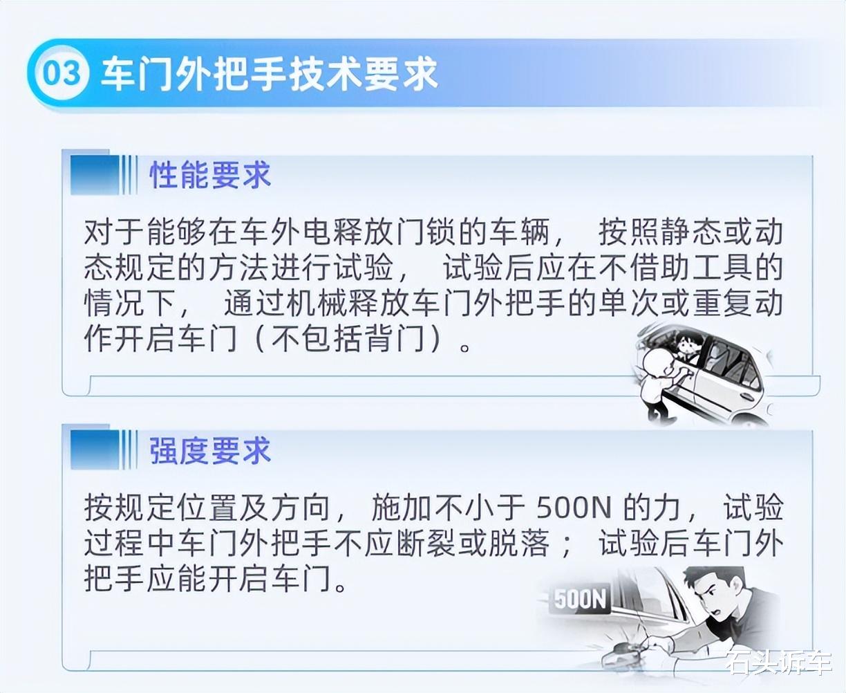 简单地说,就是要求配备机械门把手,隐藏式门把手多为电子装置,据说隐藏式门把手发生事故后弹出的概率是67%,而机械门把手是98%。