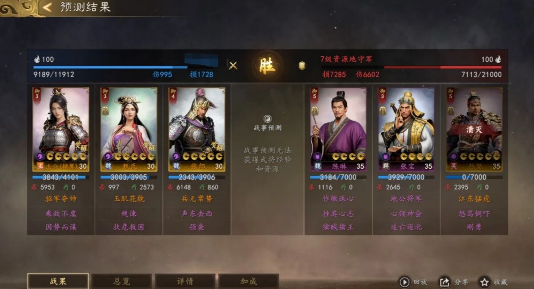 战事预测:所有高级地挑战前,务必先用该功能测试,预测结果基于士气满值状态,行军后士气不足会大幅降低胜率,务必等士气恢复后再开战