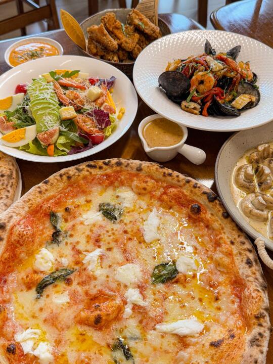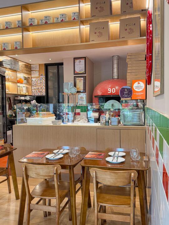 店里最吸引人的就是那座巨大的木柴窑 红彤彤的火焰在里面跳跃!!!手工揉制的面团,薄而有韧性! 上面的配料也是超级丰富,新鲜的蔬菜、浓郁的奶酪 🧀每一口披萨都能感受到那浓郁的奶香和木柴的香气交织在一起,形成了独特的口感。
