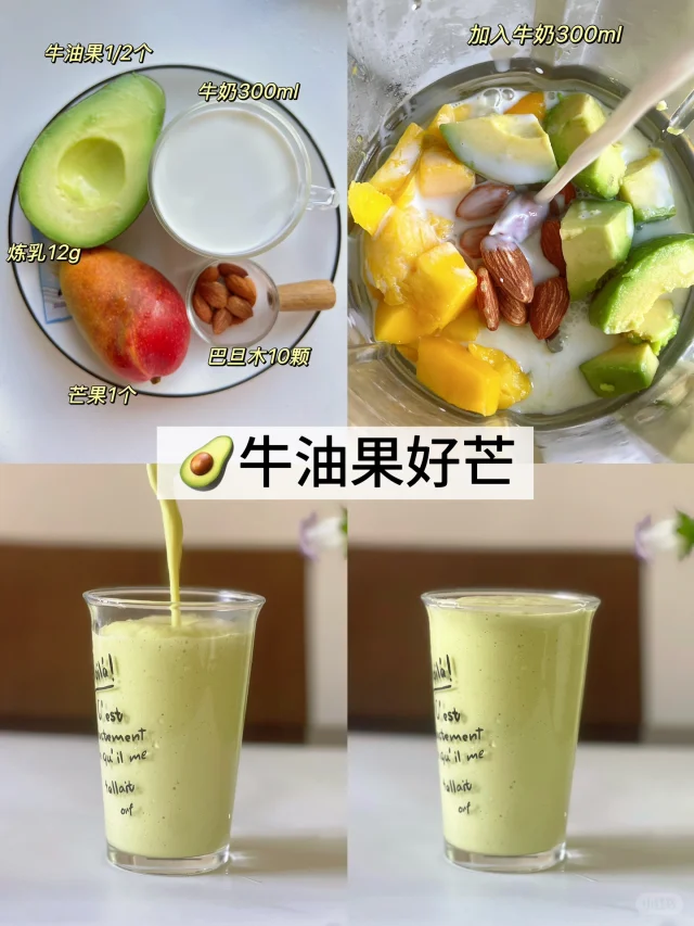 牛油果1/2个+芒果1个+巴旦木10颗+牛奶300ml +炼乳12g