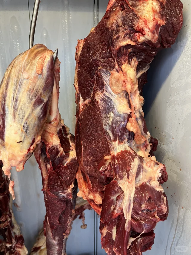 大概过了30分钟左右,黄牛分割完毕,并用挂钩挂了起来,像北方乡村市集上售卖的猪肉那样……