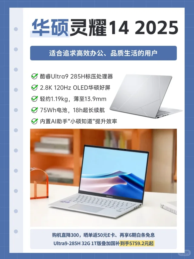 购机直降300,晒单返50元E卡、再享6期白条免息;以Ultra9-285H 32G 1T版为例,叠加国补到手5759.2元起!