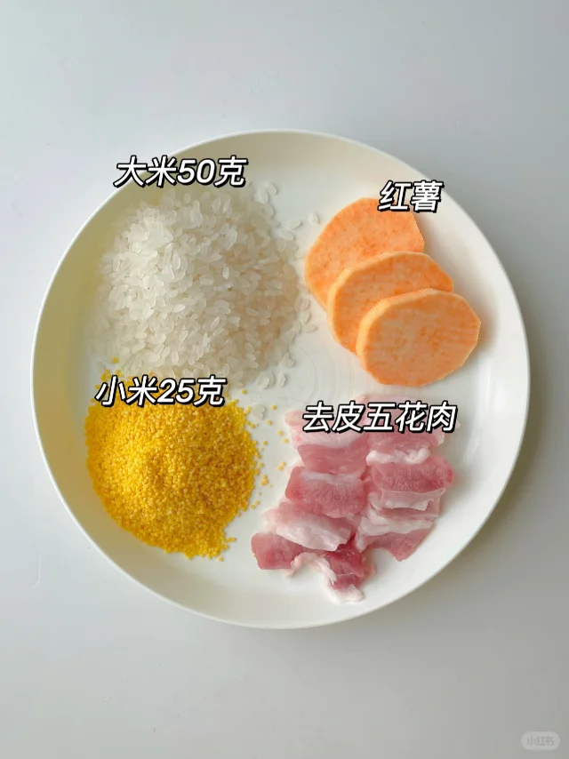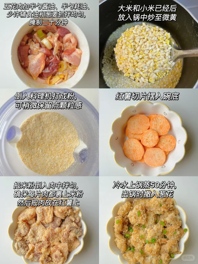 [彩虹R]米香肉香十足~ [气球R]准备食材: 1️⃣去皮五花肉一小块(偏瘦),大米50克,小米25克,红薯半根; [气球R]制作步骤: 1️⃣五花肉切薄片加半勺酱油、半勺耗油、少许辅食油和葱姜抓拌均匀,腌制二十分钟; 2️⃣大米和小米洗净,放入锅中炒至微黄,倒入料理机中打成粉,保留点颗粒感; 3️⃣红薯切片摆入碗底,米粉倒入肉中,确保每片肉都裹上米粉,然后把肉放在红薯上,冷水上锅蒸50分钟,出锅时撒入葱花~