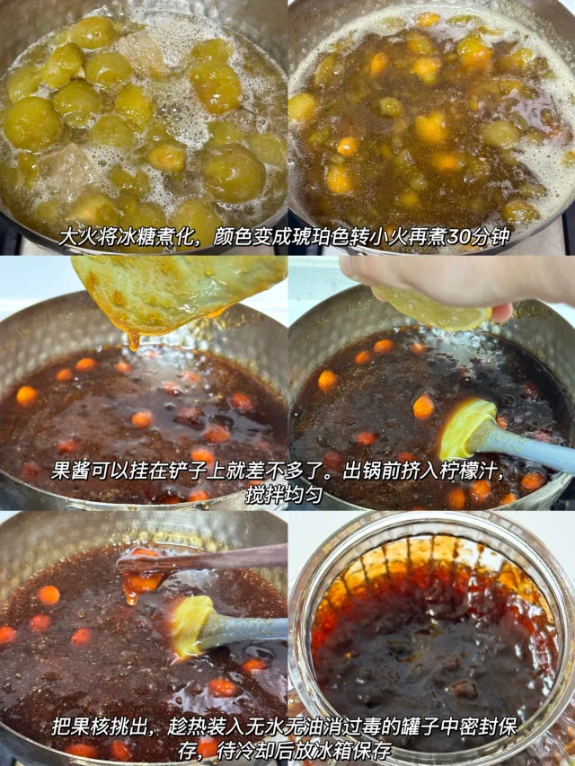 4⃣️挑出果核(果核可以保留泡水喝,非常好喝),出锅前挤入柠檬汁,搅拌均匀,趁热装入无水无油消过毒的罐子中密封保存,待冷却后放冰箱保存