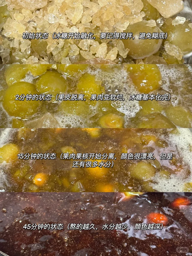 3⃣️将梅子再次倒入锅中,加入1:1的冰糖,和少许盐,大火将冰糖煮化,水分煮出来至果肉全部软烂,果肉和果核分离,颜色变成琥珀色转小火再煮30分钟,这时果酱可以挂在铲子上