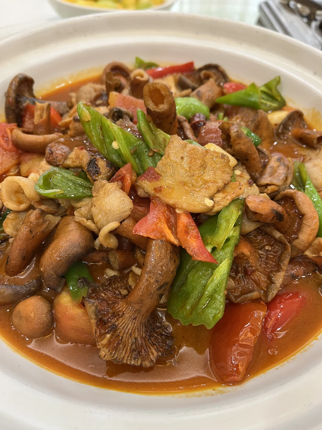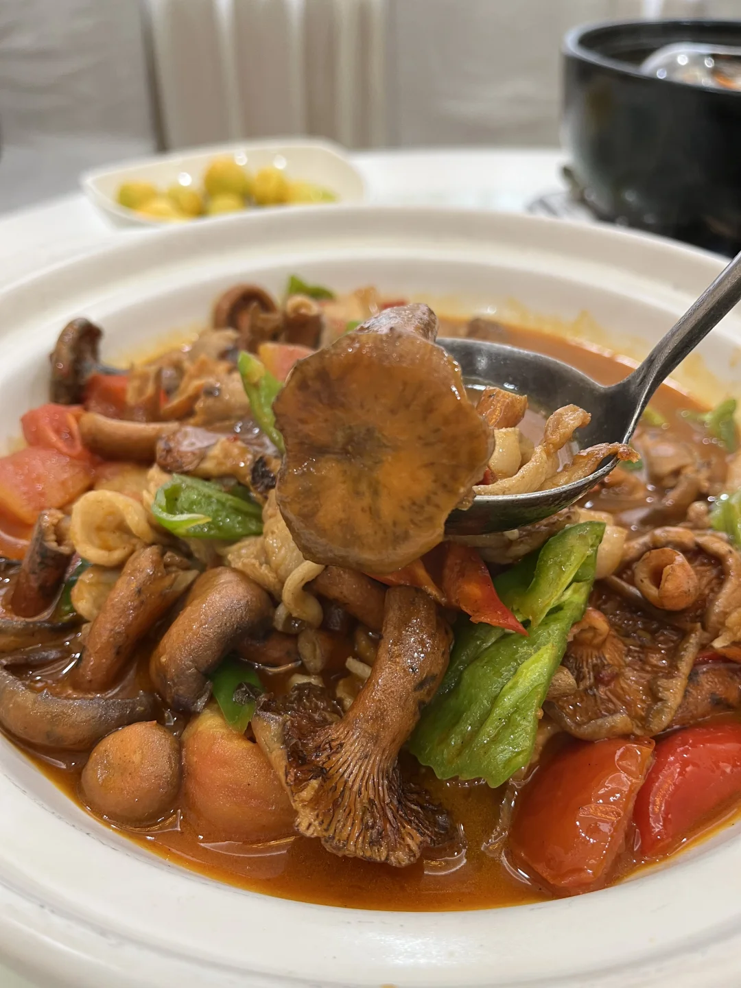 社饭,我们赶了个尾巴,分别之后,胡大姐邀请,“等到枞树菌过来,邀请大家再尝鲜……”前几天,我们吃到了最时鲜的枞树菌,用土五花肉来烧,加了番茄、青椒等,风味更佳。据说,其它的菌子一般都可以人工培育和干制,枞树菌不仅人工不能培育,还不能干制,储存也难,必须要趁着新鲜期,赶紧享用。像这次冷链发来,只有两天的保鲜期。良辰美景奈何天,好菌子一定不可辜负呢!否则鲜味稍纵即逝!