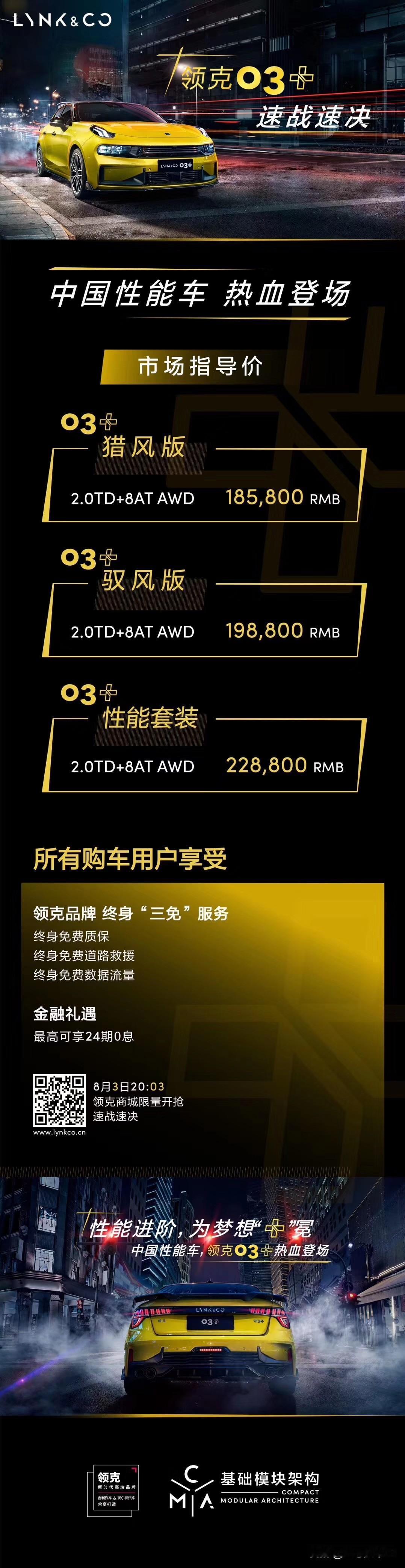 领克03+于今晚正式上市,新车共计推出三款车型,猎风版18.58万元、驭风版19.88万元、性能套装版22.88万元,2.0TD+8AT AWD将成为全系标配。5.9秒破百的四驱小钢炮,这样的价格你们觉得行吗?[灵光一闪]