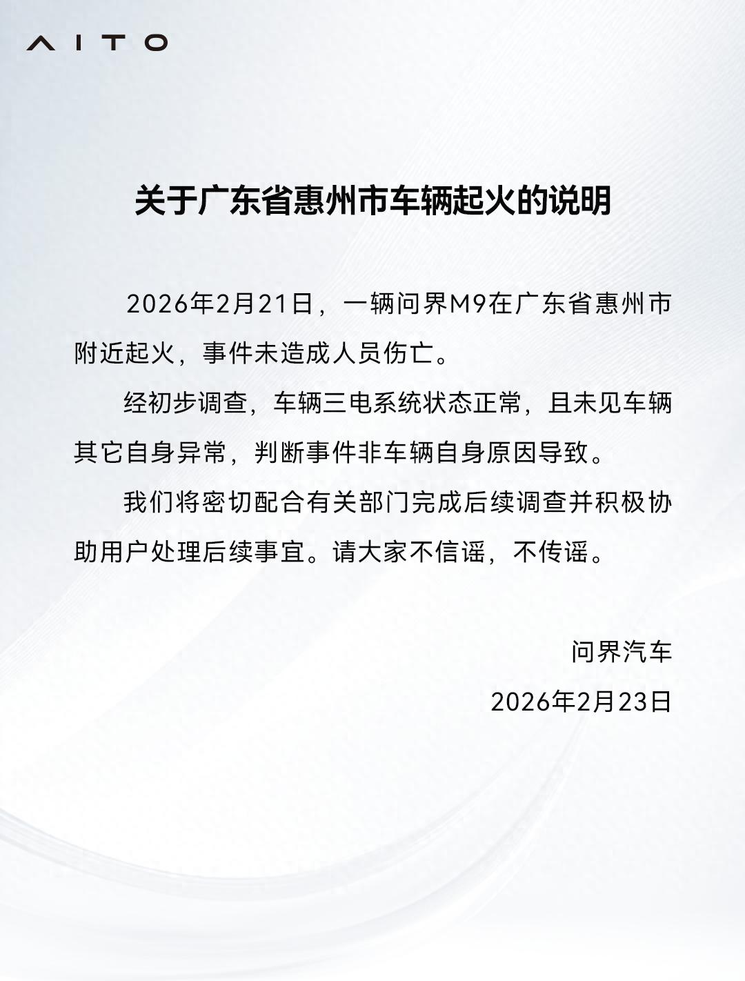 2月23日,问界汽车发布关于广东省惠州市车辆起火的说明:经初步调查,车辆三电系统状态正常,且未见车辆其它自身异常,判断事件非车辆自身原因导致。