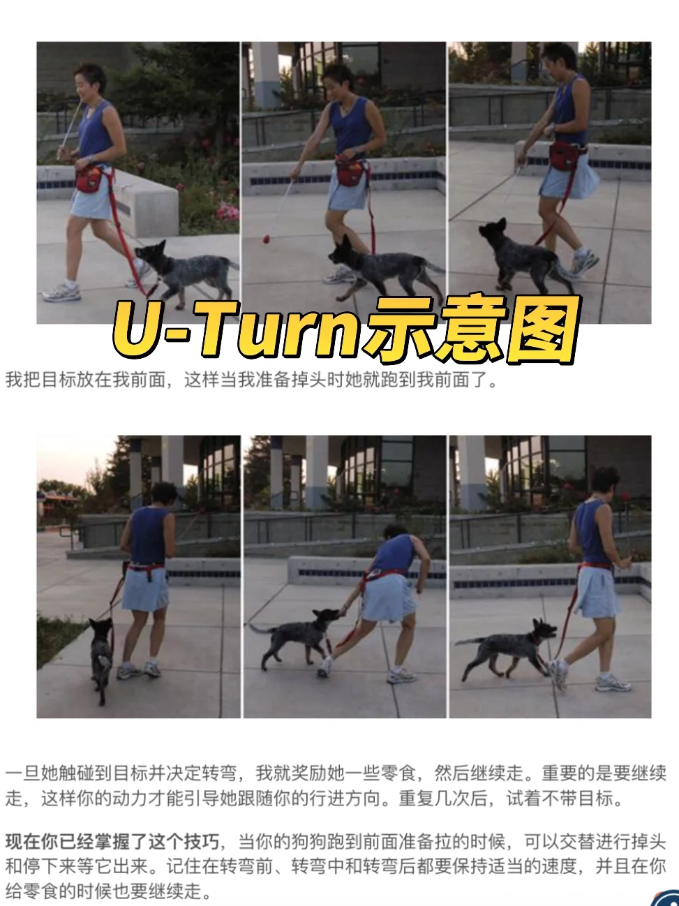 U-turn:狗走在人前面时,直接走一个大半圆形的回转,特别适合遛狗时需要掉头或者调整狗的位置。