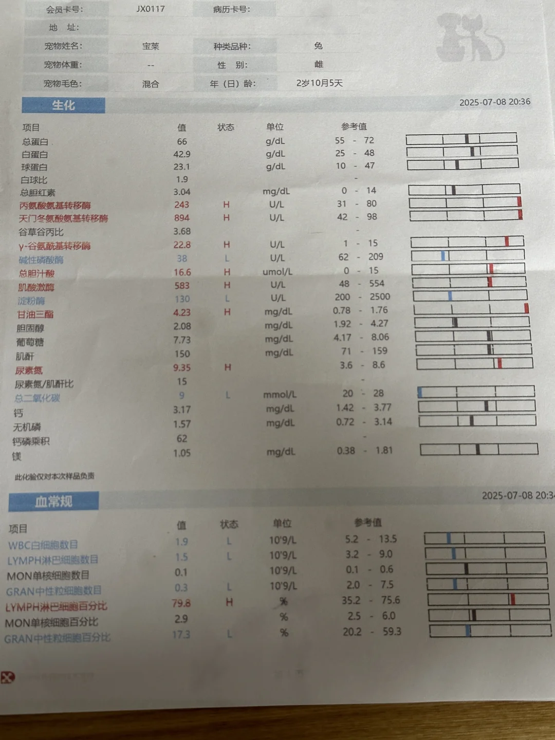 8号下午五点半叫莱莱吃兔粮没有反应,这时候状态不对蹲在角落,抱它也没有反抗咬我踢我,耳朵温度有点凉,配合喝了电解质赶紧出门一小时后到达医院,拍片没有胀气但是肚子呼吸急促怀疑中暑,体温40度(家里很凉快不热,车里也开了空调),抽血生化验报表很糟糕,肝损伤,白细胞值太低免疫系统出了问题,胆囊形状不规则,心脏没有肥大牙齿很健康肠道也正常,但是打了止痛药也没用,找不出原因不确定是中暑还是中毒,下了病危,刚开始还能顺利抽血后面耳朵就找不到血管了,留置针扎在了手上,输液的十几分钟状态已经很常很差了,莱莱不停抬头换姿势想让自己打起精神,又补了一针止痛两针肾上腺素,去了手术室抢救 吸氧 插管,看着它心跳一点点停止跳动,眼睁睁的看着白天还活蹦乱跳的莱莱就这样痛苦走了。