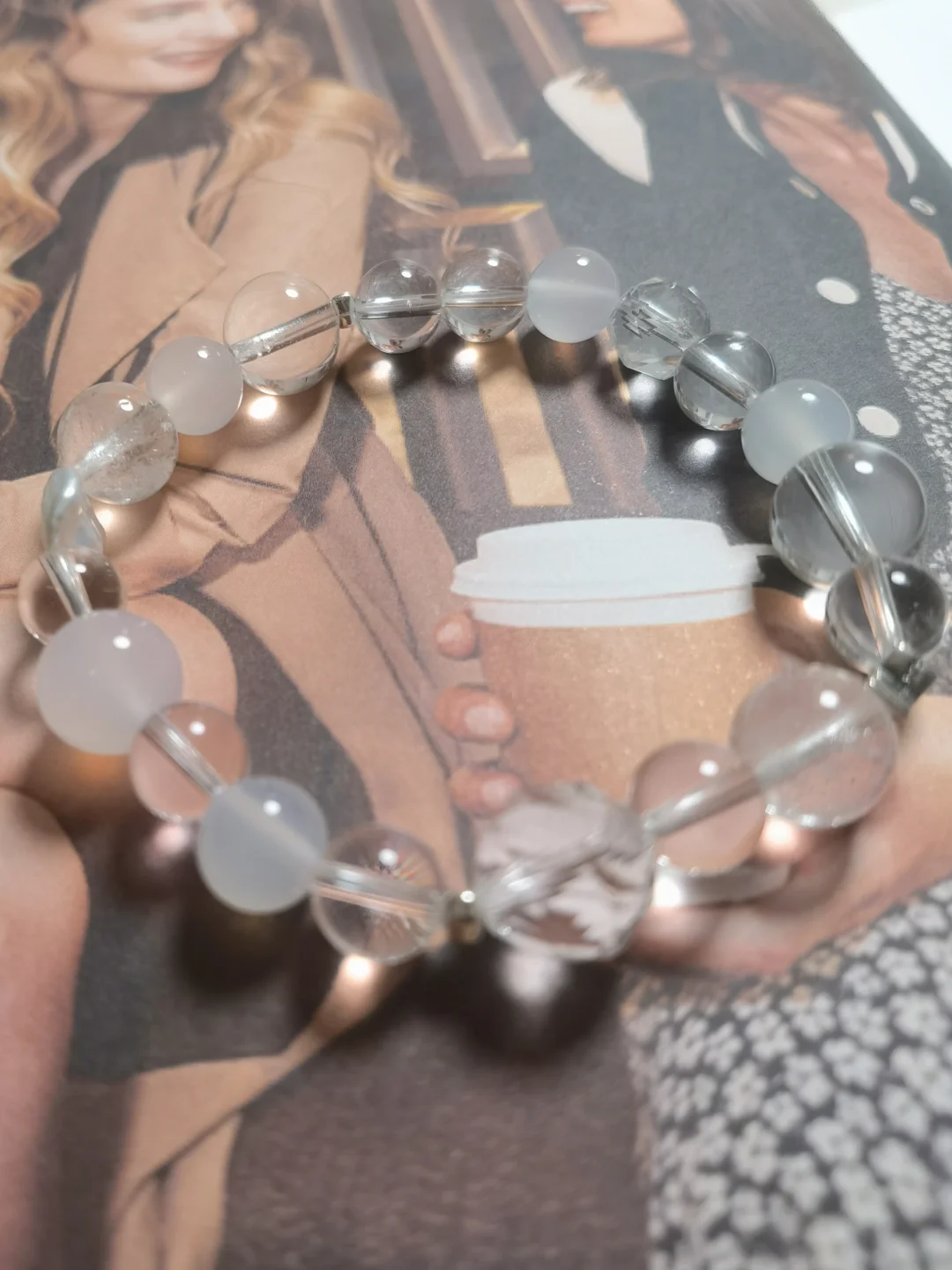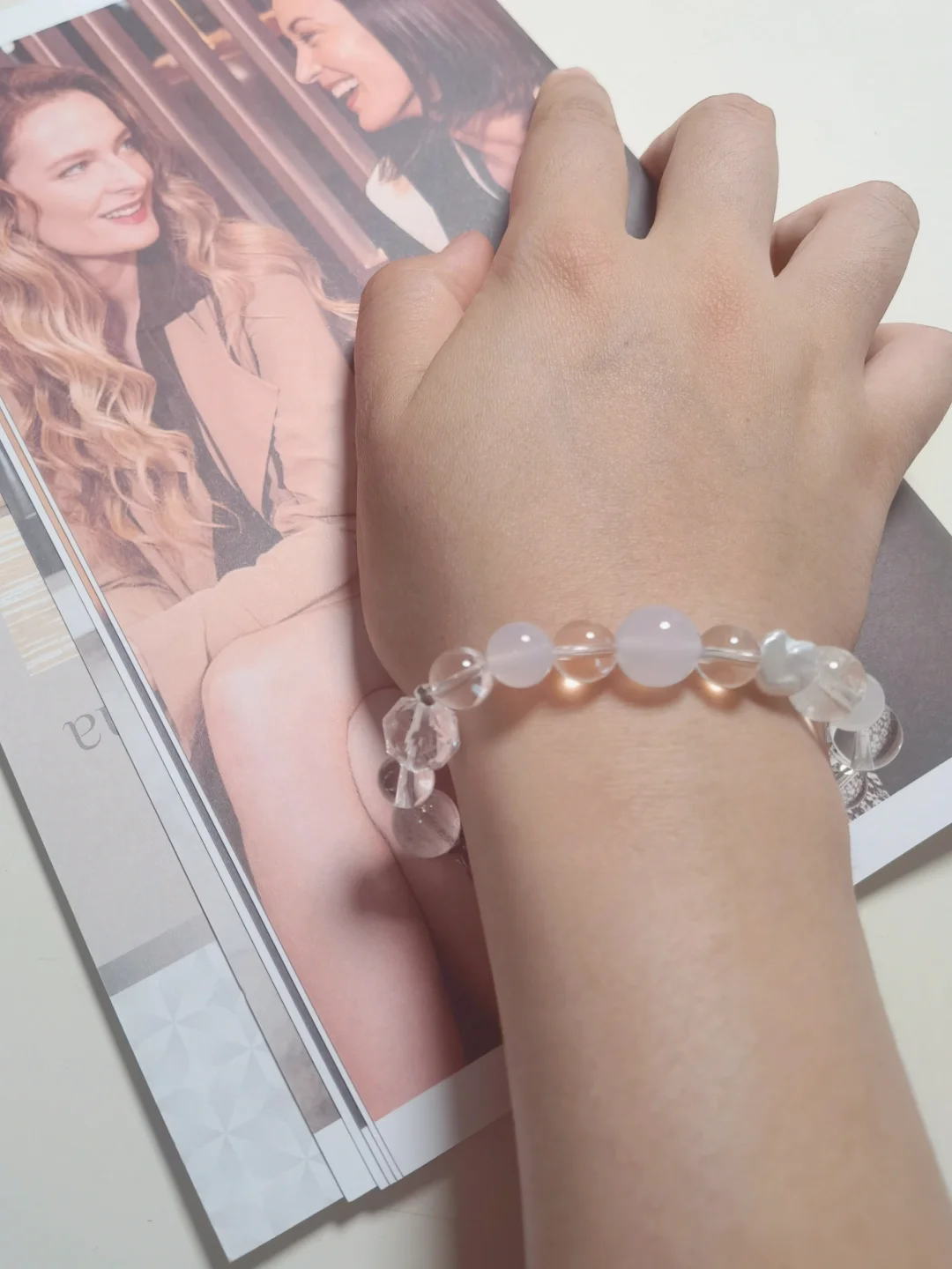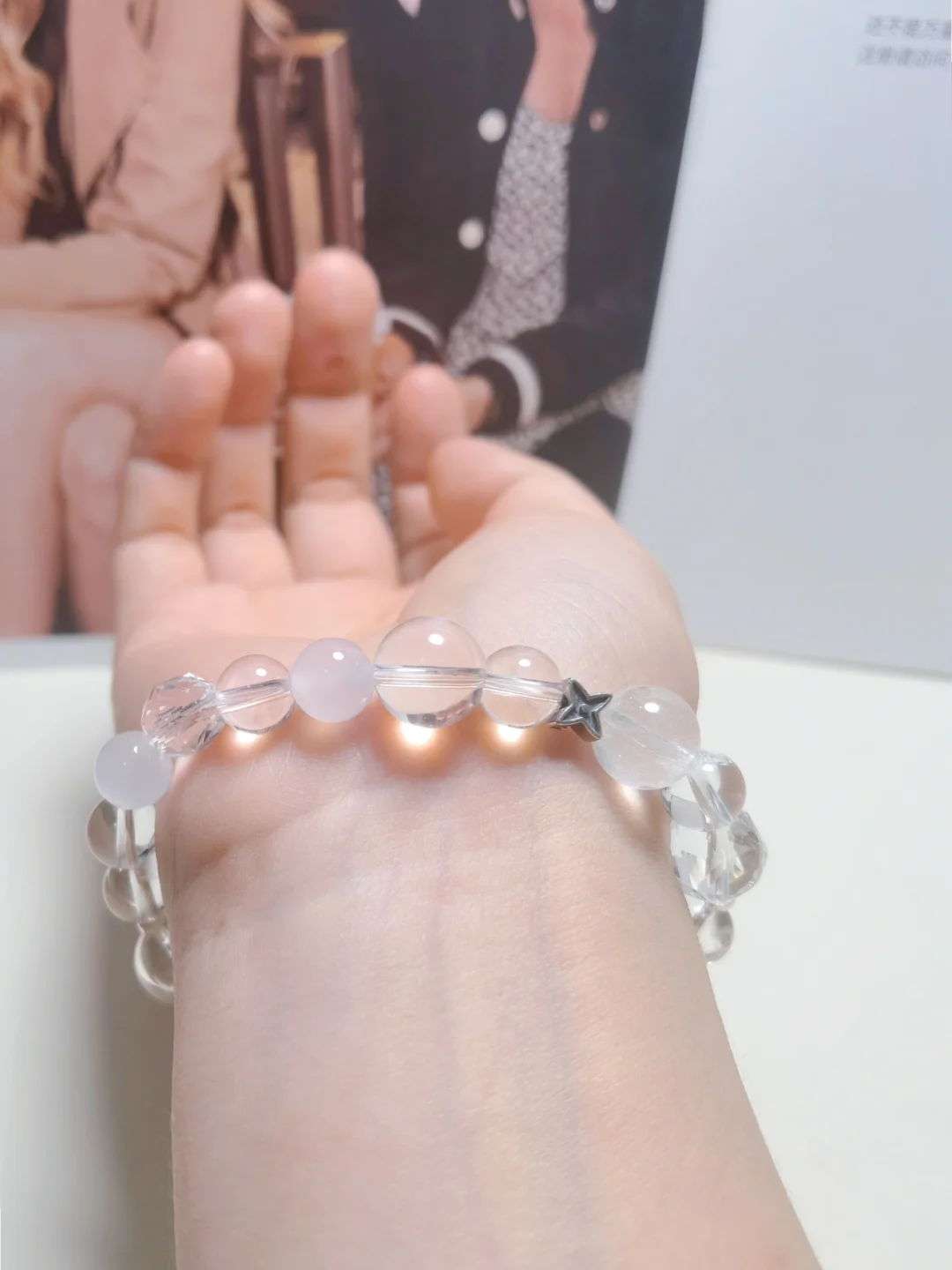 之前在学习水晶疗愈的时候,对白水晶非常有好感,因为它的通透感很jue,有那种清透无暇的光泽,真的百看不厌!像把一小块凝固的月光戴在了手上,清清凉凉的,一点不压手,夏天尤其舒服,完全不会硌得慌或者有异物感。戴着敲键盘、写东西都毫无压力,有时候甚至忘了它的存在,但它就在那儿默默发光。不知道是不是心理作用,烦躁或者思绪乱飞的时候,摸摸它冰凉光滑的表面,看着它纯净的光,真的会不自觉地深呼吸,感觉整个人都沉静、清爽了一些。像是给大脑做了个SPA🧖♀️