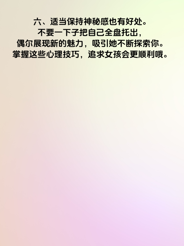 一、追求女孩,心理技巧至关重要。了解她的心思,才能走进她的世界。 二、首先,要学会倾听。耐心听她倾诉喜怒哀乐,让她感受到被重视。比如她分享工作的烦恼,你认真回应,给出安慰和建议,她会觉得你贴心。 三、再者,展现真诚。别耍心眼,真心对待她的一切。用实际行动证明你的心意,而非只是嘴上说说。 四、制造惊喜也必不可少。偶尔送她一束花,带她去她想去的地方,给平淡的生活增添浪漫色彩。 五、尊重她的选择和想法。在重大事情上,尊重她的决定,让她知道你尊重她的独立人格。 六、适当保持神秘感也有好处。不要一下子把自己全盘托出,偶尔展现新的魅力,吸引她不断探索你。掌握这些心理技巧,追求女孩会更顺利哦。