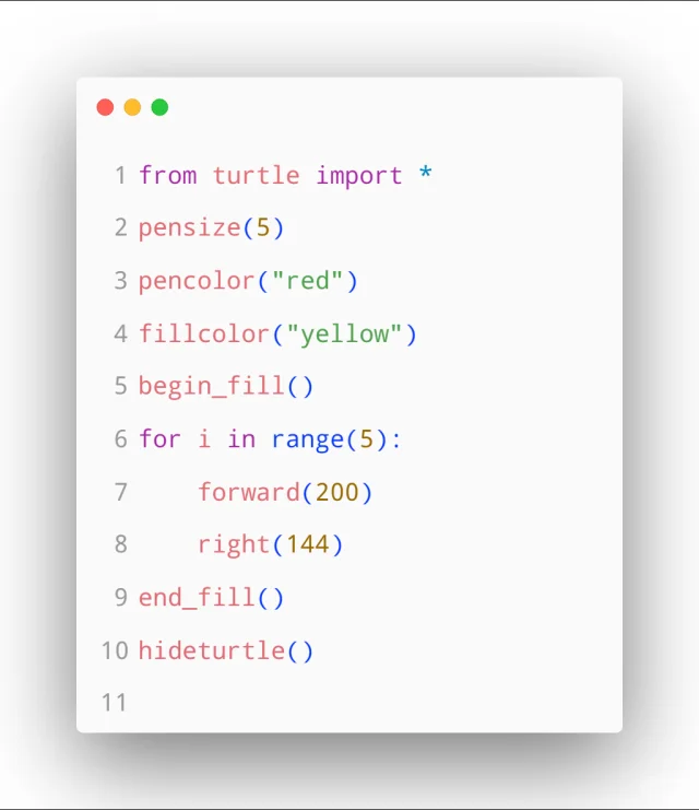 哈喽呀,各位 Python 小探险家们👋!今天我要带大家走进turtle模块的神奇绘图世界,一起绘制一颗超亮眼的五角星✨,过程超简单,0 基础也能秒上手~ 🎨你知道吗,turtle模块就像是 Python 为我们精心准备的魔法绘图盒🪅,只要轻轻施展代码魔法,就能在屏幕画布上创造出各种奇妙图案。 下面就来看看绘制这个超炫五角星的秘籍吧👇 🌟代码实现步骤: 准备魔法画笔 from turtle import * 这一步,就如同打开了魔法绘图盒,把里面的神奇画笔都准备好了。 2. 定制画笔外观 pensize(5) pencolor("red") fillcolor("yellow") pensize(5)是给画笔加粗,让线条更明显;pencolor("red")把画笔颜色调成了热情的红色,而fillcolor("yellow")则是为之后填充五角星准备了明亮的黄色,是不是已经开始期待了? 3. 绘制五角星轮廓并填充 begin_fill() for i in range(5): forward(200) right(144) end_fill() begin_fill()就像我们准备开始给一个图案上色啦。然后通过这个循环,画笔每次向前走 200 步,再精准右转 144 度,重复 5 次,五角星的轮廓就出现了,接着end_fill()把之前设定的黄色填充进去,一颗闪耀的五角星就诞生啦! 4. 隐藏画笔 hideturtle() 最后,让辛苦绘制的画笔悄悄藏起来,只留下我们完美的作品。 是不是超有趣?宝子们赶紧打开 Python,动手试试,让这颗五角星在你的代码世界里闪耀起来吧💖