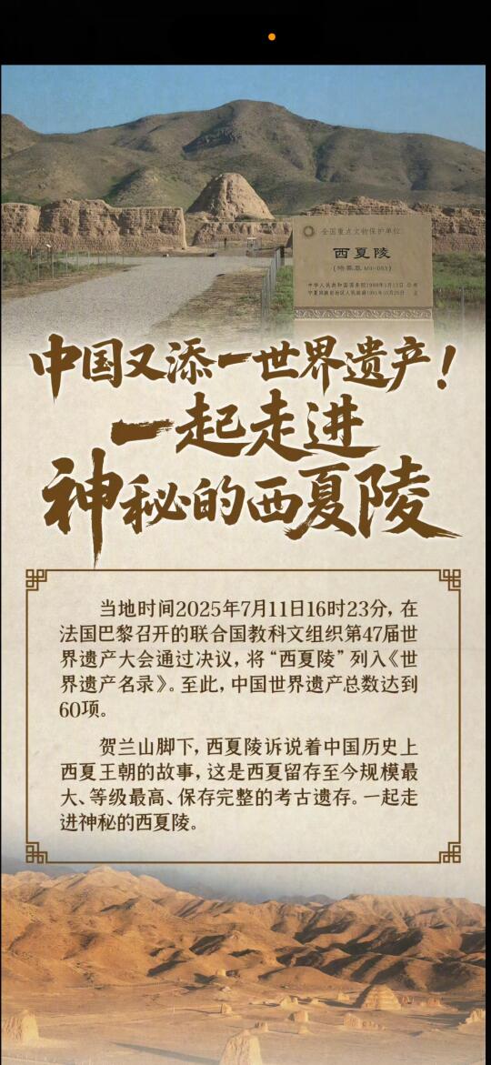 北京时间7月11日,宁夏“西夏陵”成功列入《世界遗产名录》!至此,🇨🇳世界遗产总数冲上60项! · 西夏王朝(1038-1227)的皇家陵墓群,沉睡贺兰山脚近800年,9座帝陵+271座陪葬墓,占地40平方公里,被称“东方金字塔” •