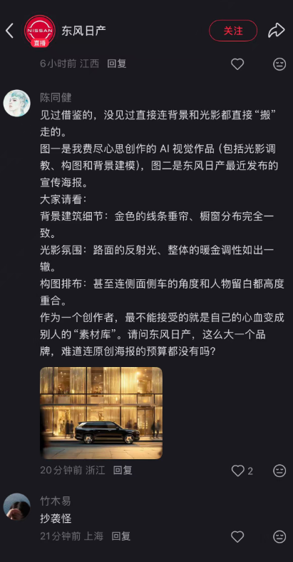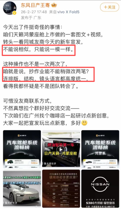 前脚东风日产高管在微博吐槽友商抄袭,转头官号就被锤照抄极氪9X海报,一键把人家的车P成你家的,贴个logo和slogan,直接就发官号,这也太明目张胆了吧!