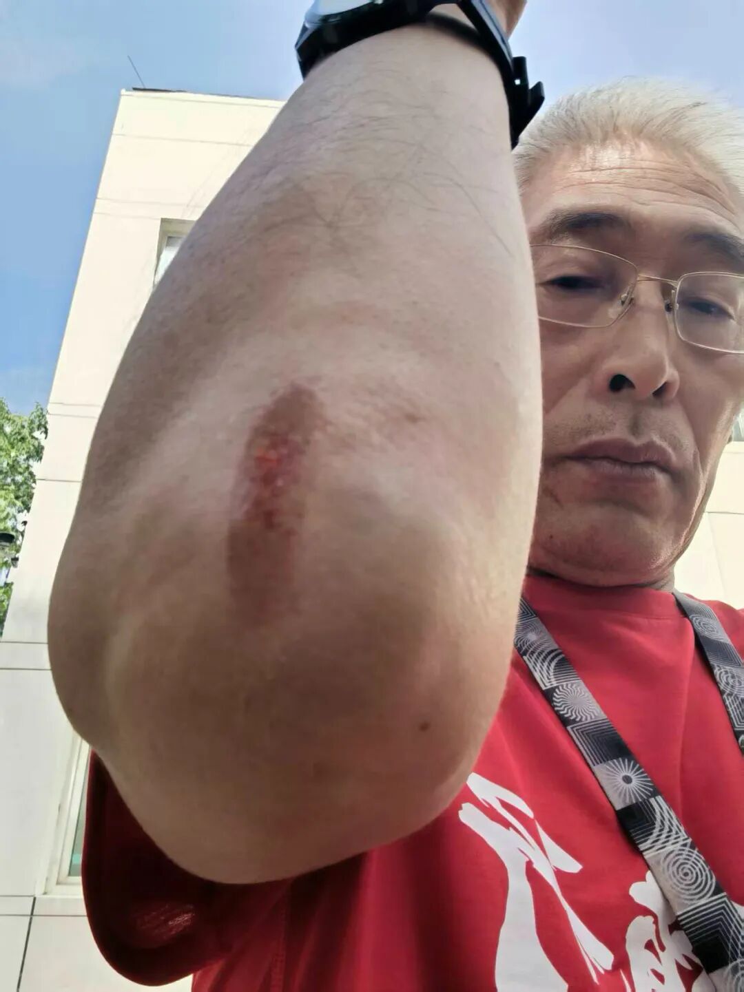 回过头再说马趴的深层次原因和后果。若人体是一个物理上的刚体,则倒地后全面落地受力比较均匀(严格说也不均匀,从头到脚转动半径不同惯量递减)定无大碍。再复杂一点,脚踢到跑道褶皱后并未固定在原地,而是在惯性作用下身体在倾倒的同时继续向前运动,落地时克服阻力就向前滑动,这是一个复合运动。另外,人体是个非刚性生物体,倒地时有反射性的生物反应,比如手按地肘撑地等。于是,左肘被搓了一大块皮,津津渗出红色液珠。右手握着“脉动”把光滑的瓶身搓毛了。